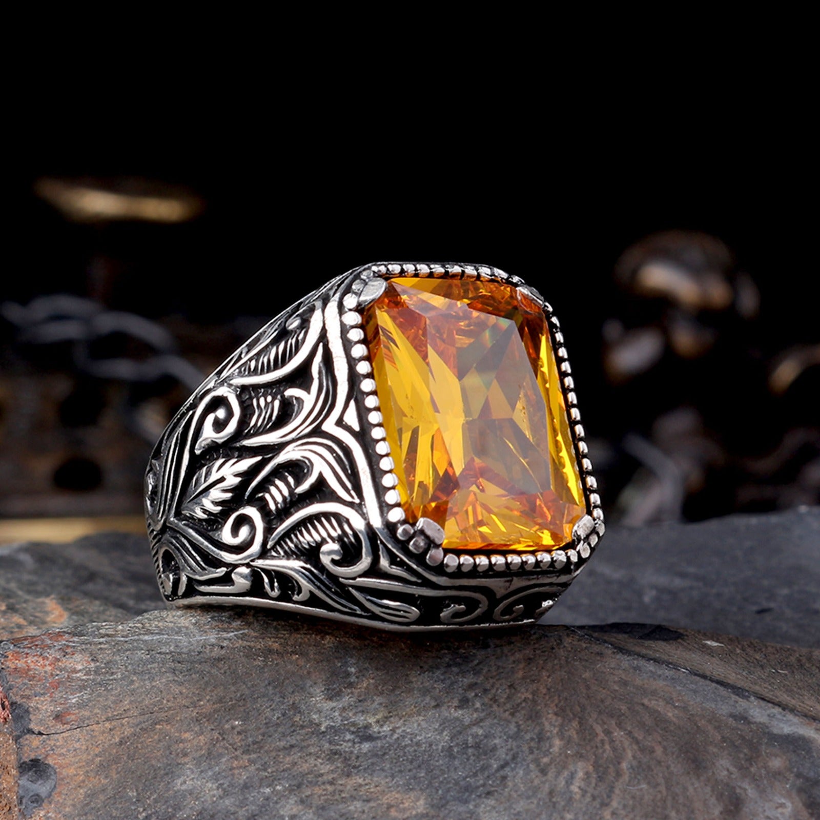 Parlak sarı zirkon taşıyla tasarlanmış 925 ayar gümüş erkek yüzük, dikkat çekici bir tarz sunar.
