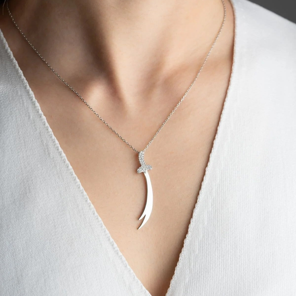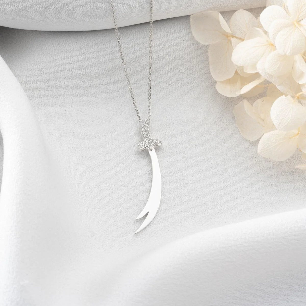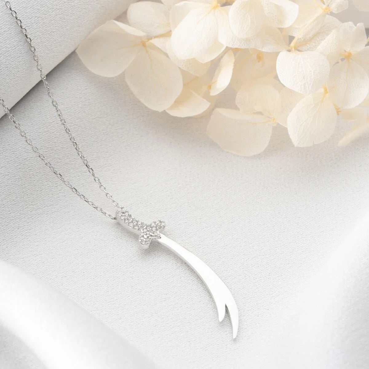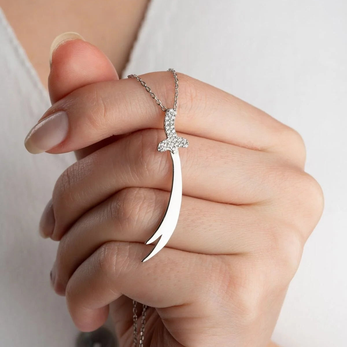 Işıltılı taş detaylı gümüş Zülfikar kolye, zarif ve anlamlı bir aksesuar.