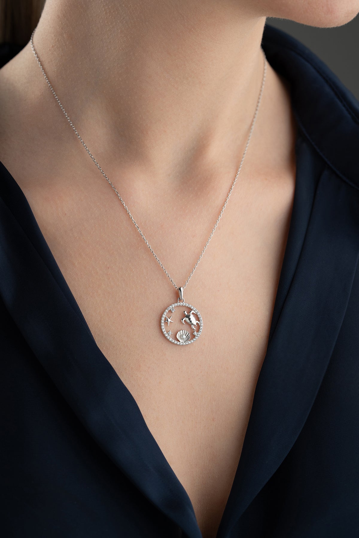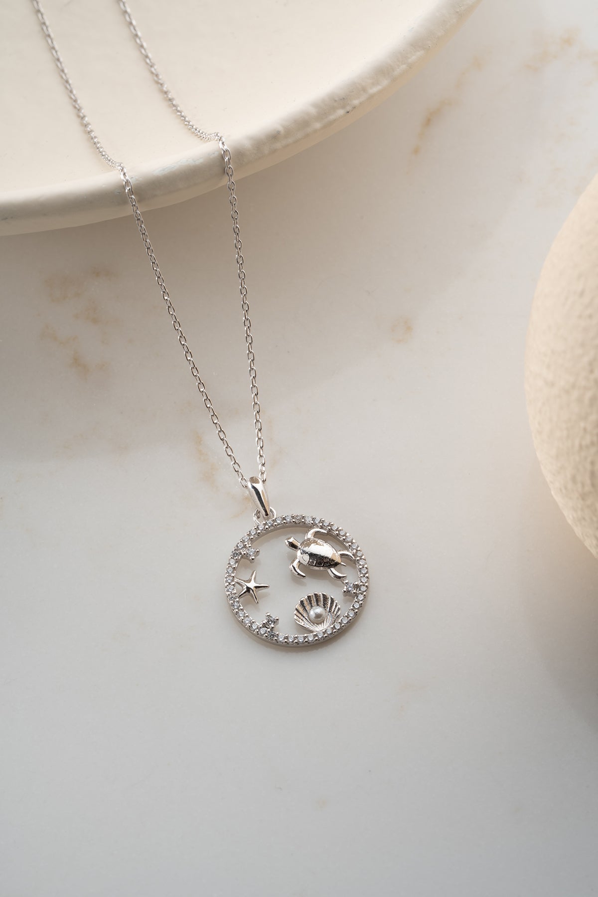 Diese elegante 925 Sterling Silber Halskette mit Schildkrötenmotiv, verziert mit Seestern-, Muschel- und Perl-Details, wurde speziell für Meeresliebhaber entworfen. Mit funkelnden Zirkonsteinen veredelt, passt sie perfekt zu Alltags- und Festlooks.