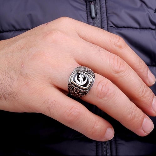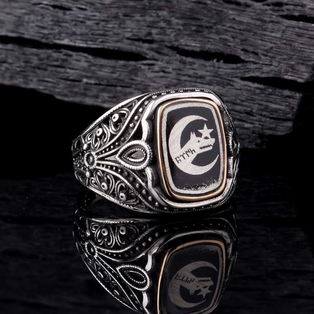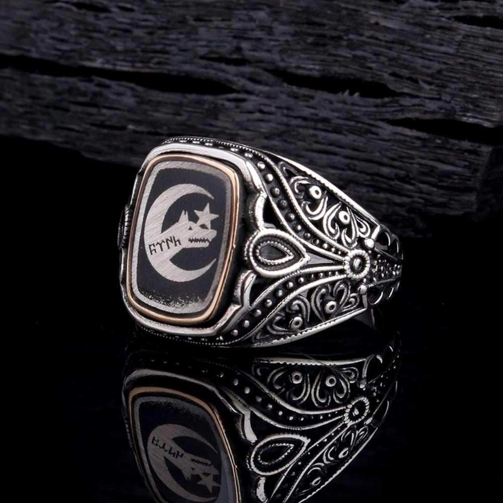 ürk tarihinden ilham alan bozkurt ve Göktürkçe detaylı, 925 ayar gümüşten üretilmiş şık ve karakterli erkek yüzük.