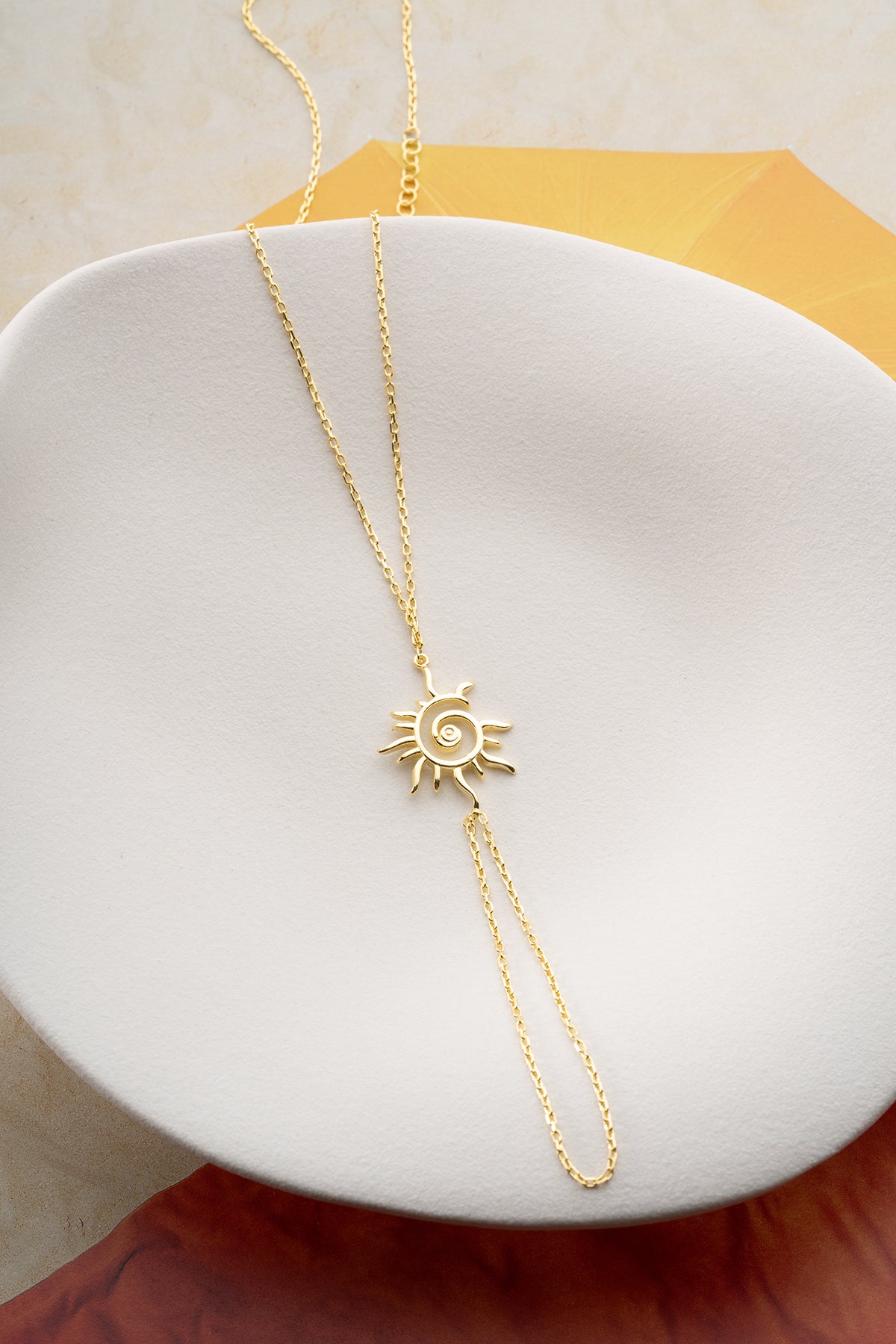 Edle vergoldete Handkette aus 925er Silber mit Spiral-Sonnenmotiv – Modell Elia.