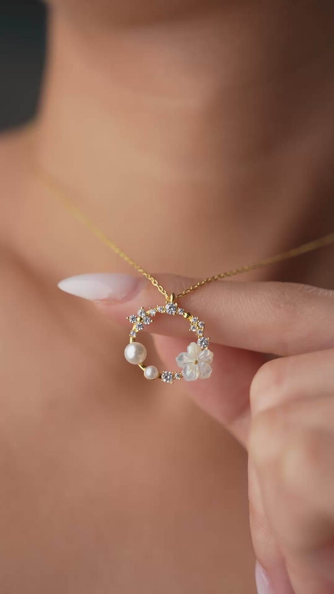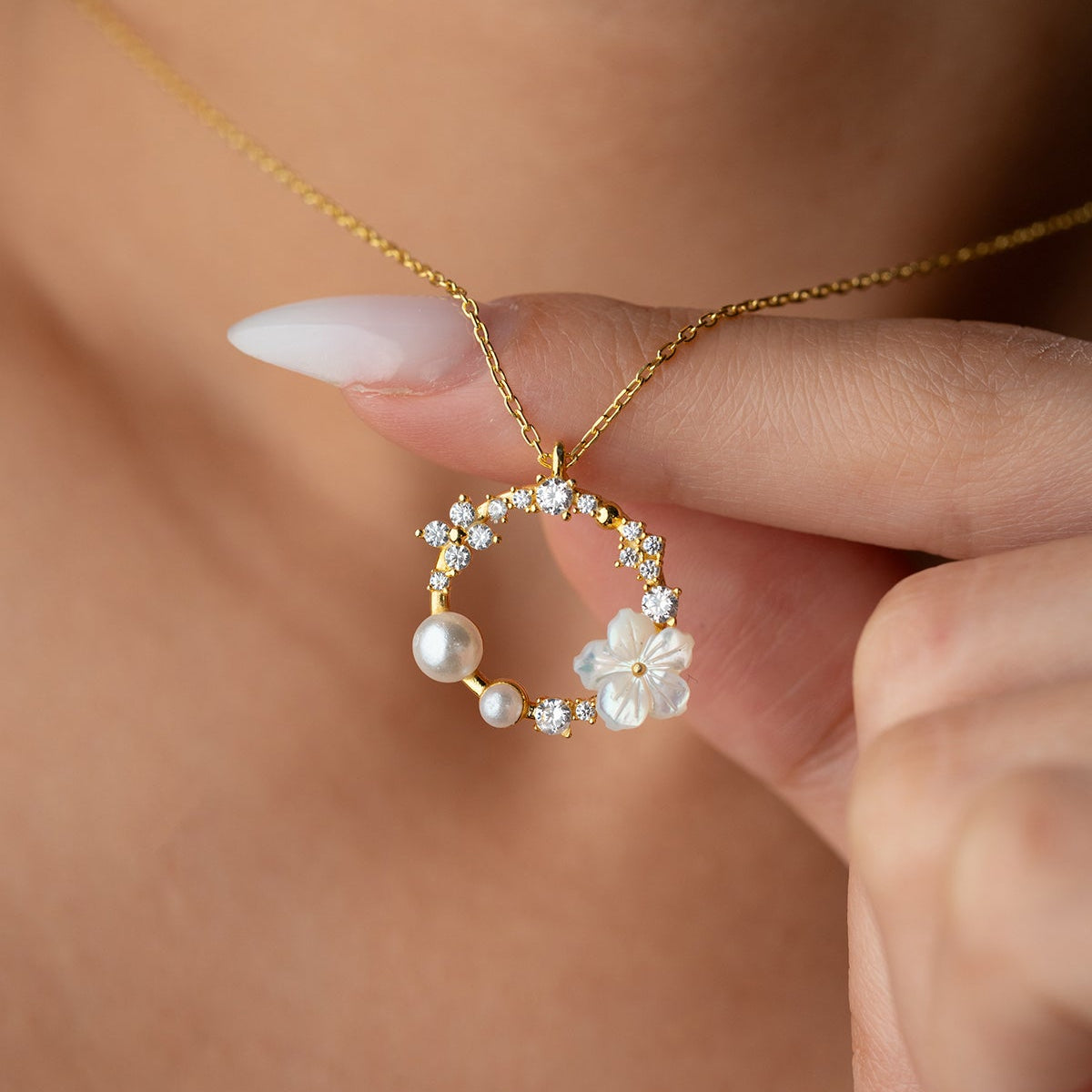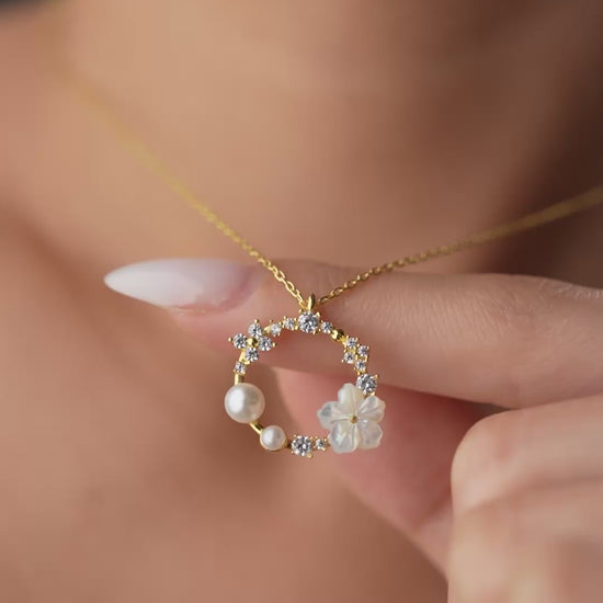 Elegante Halskette aus 925er Sterlingsilber mit einem ringförmigen Zirkonstein, Perlenverzierungen und einem weißen Blumenmotiv.