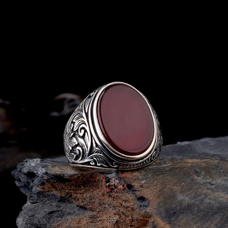 Ein eleganter Herrenring mit natürlichem Achatstein und kunstvoller Kalligrafie-Gravur. Zeitloses Design für stilbewusste Männer.