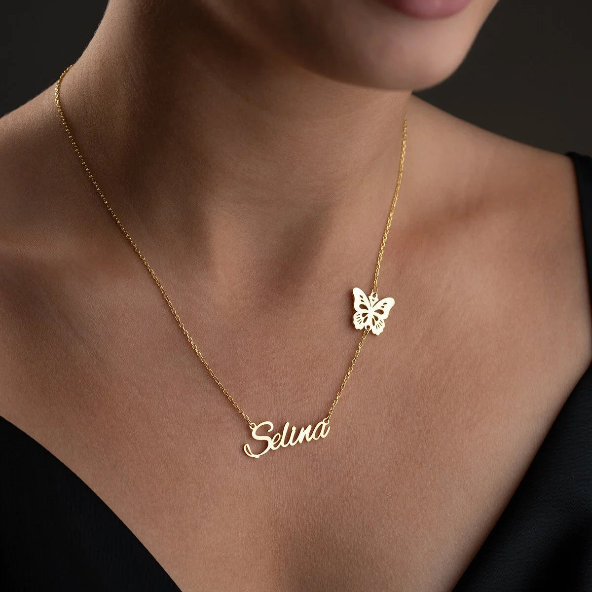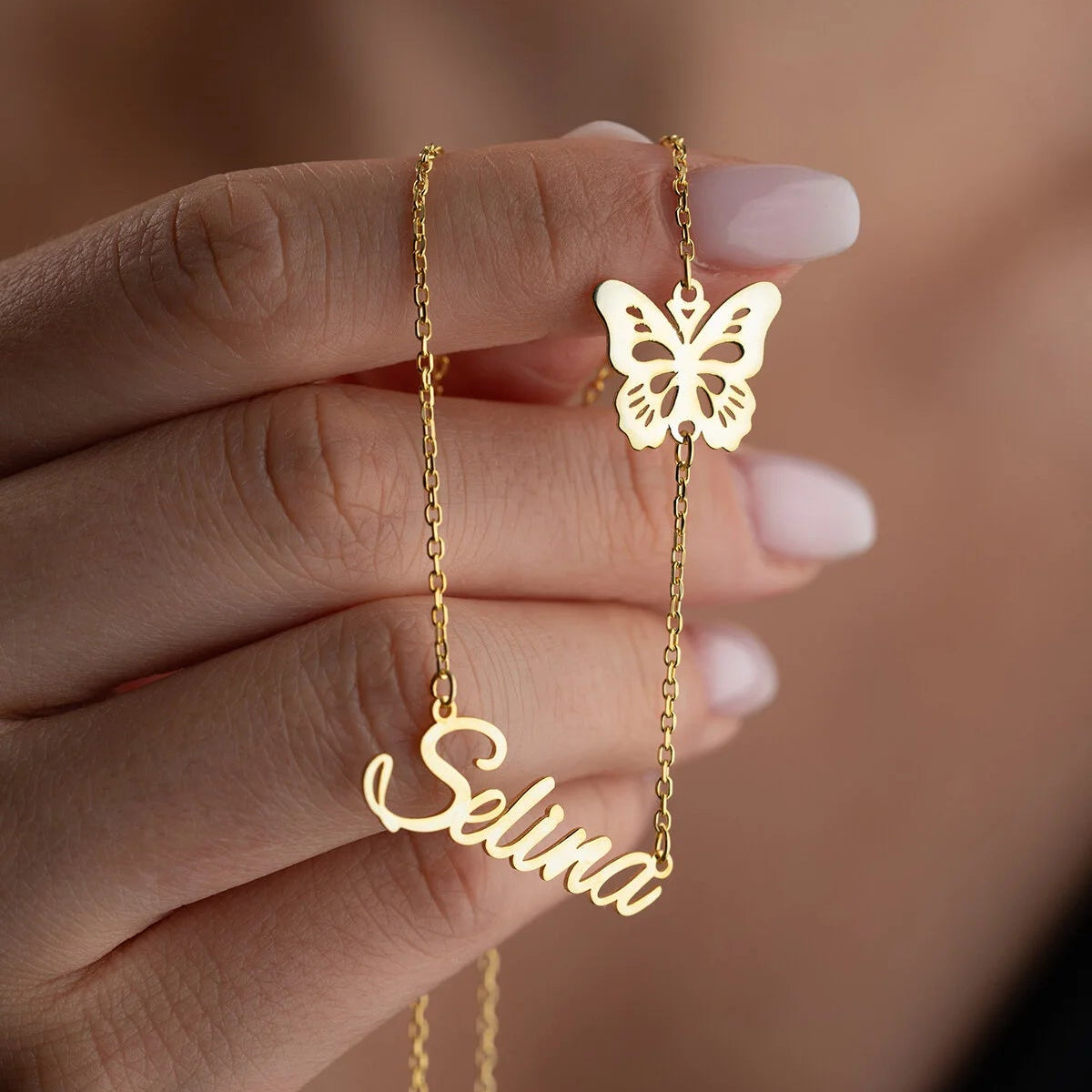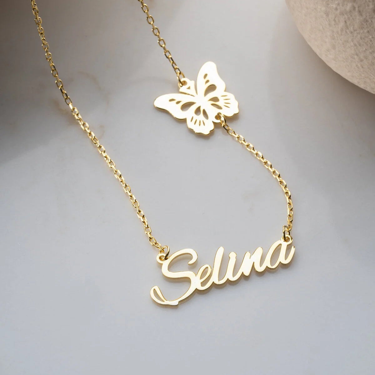Kelebek detaylı, kişiye özel tasarım 925 ayar gümüş isim kolyesi.