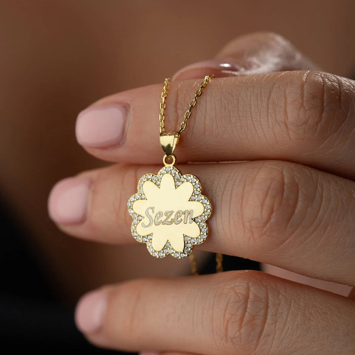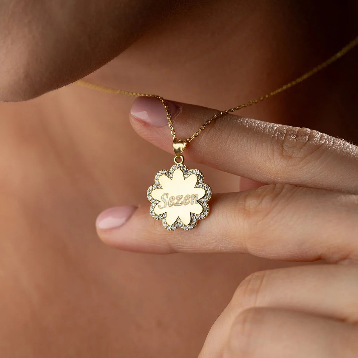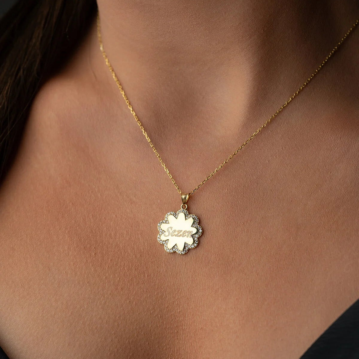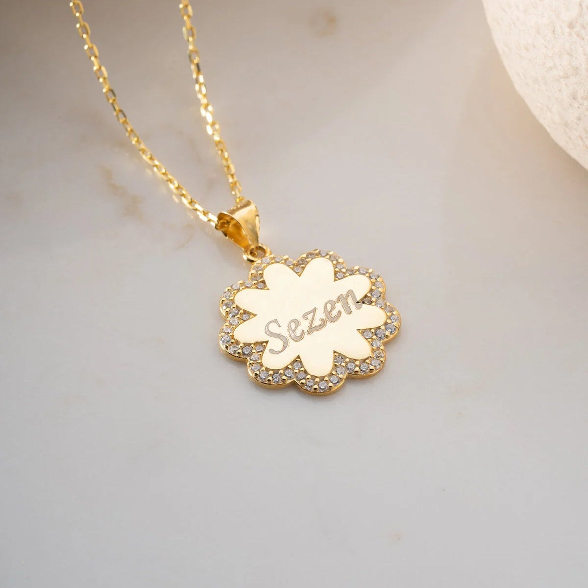 Zirkon taşlı çiçek tasarımıyla öne çıkan, üzerine isim yazılabilen zarif kolye. Özel ve anlamlı bir hediye seçeneği.