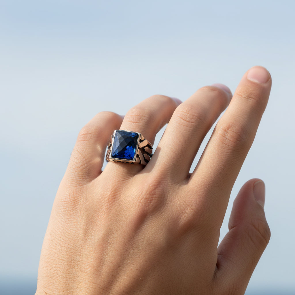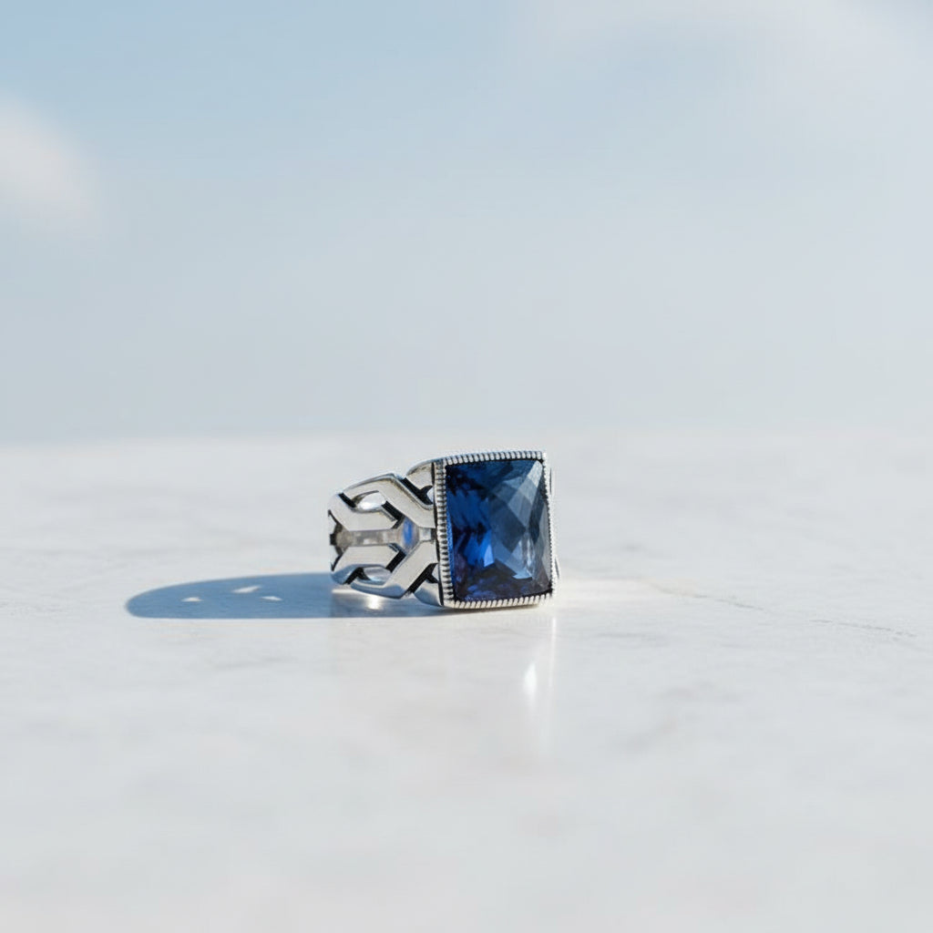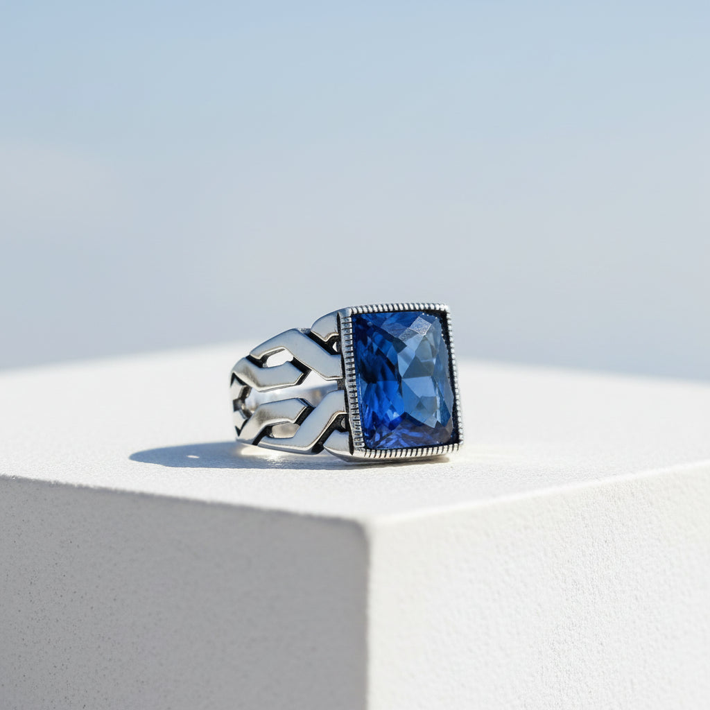 Mavi Zirkon Taşlı Erkek Gümüş Yüzük