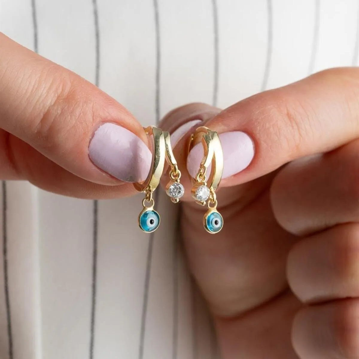 925er Silber, vergoldete Creolen mit emailliertem blauem Nazar-Anhänger und Zirkonia-Detail.