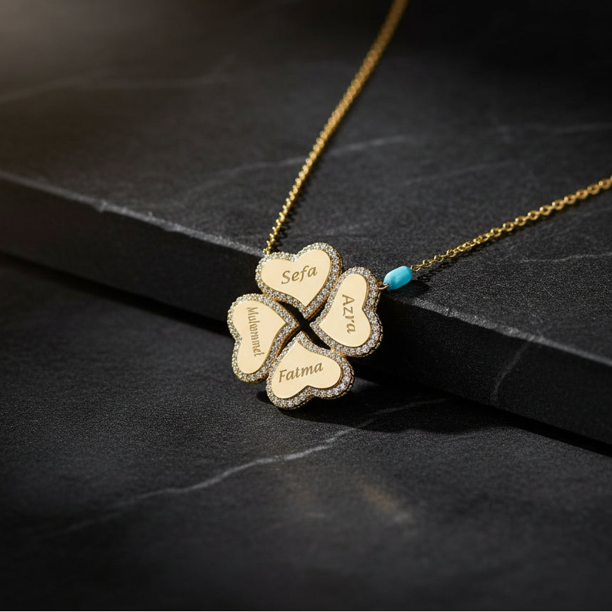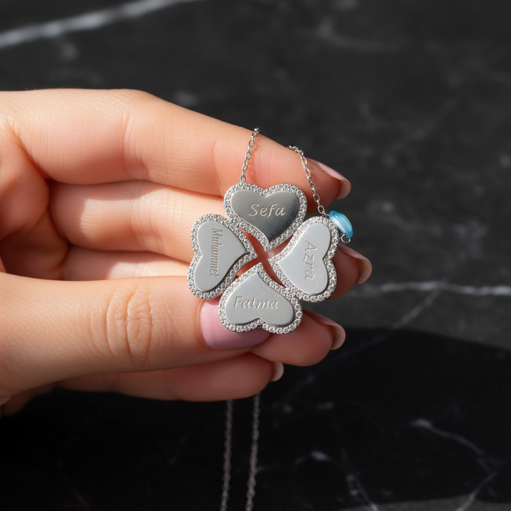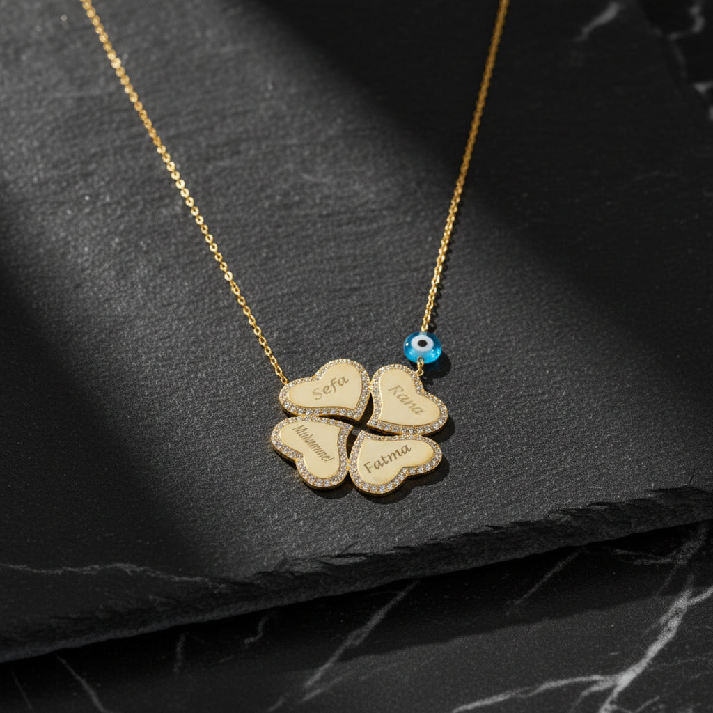 Personalisierte Familien Kleeblatt Halskette für Mama, mit Kindernamen und funkelnden Herzdetails. Ein liebevolles Geschenk zum Muttertag.