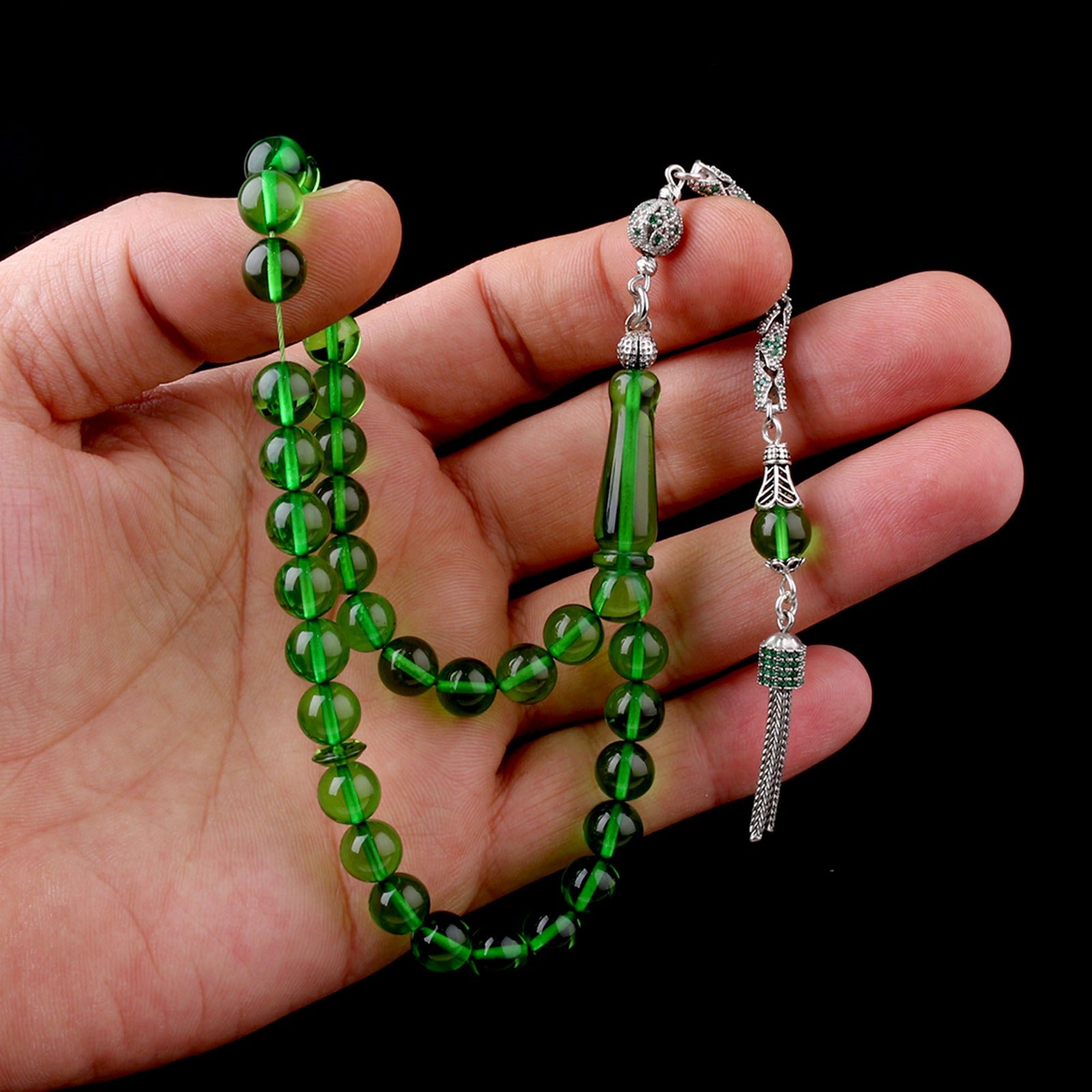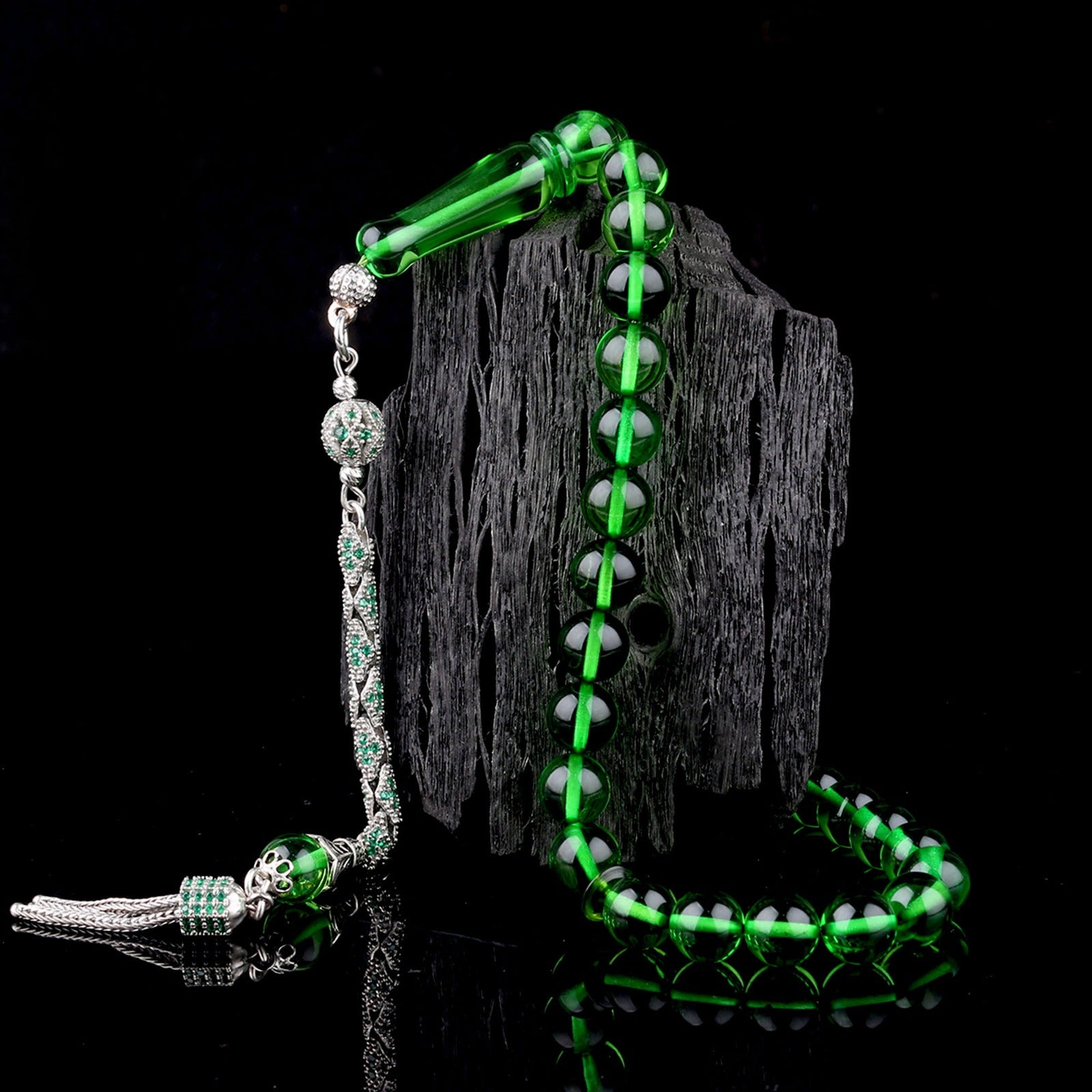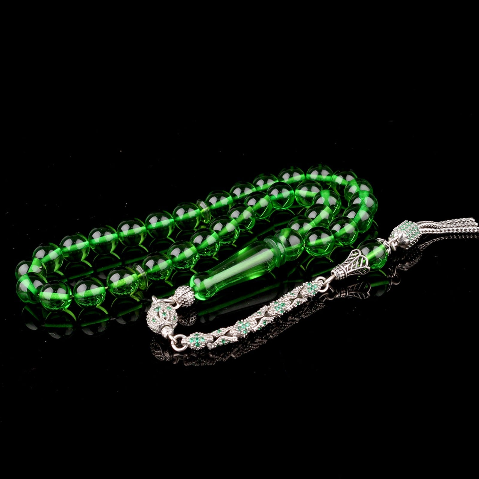 Zirkon taşlı gümüş püsküllü, orijinal ve sertifikalı yeşil renk damla kehribar tesbih.