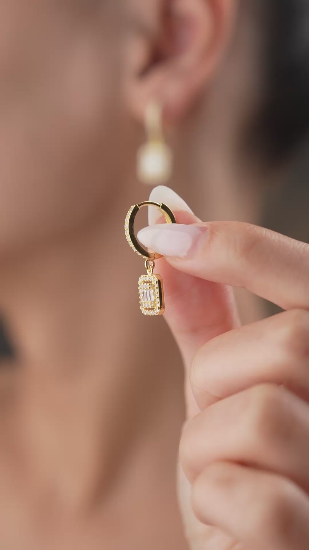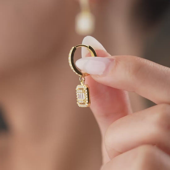 Gold plated hoop earrings made of 925 sterling silver with baguette stones.