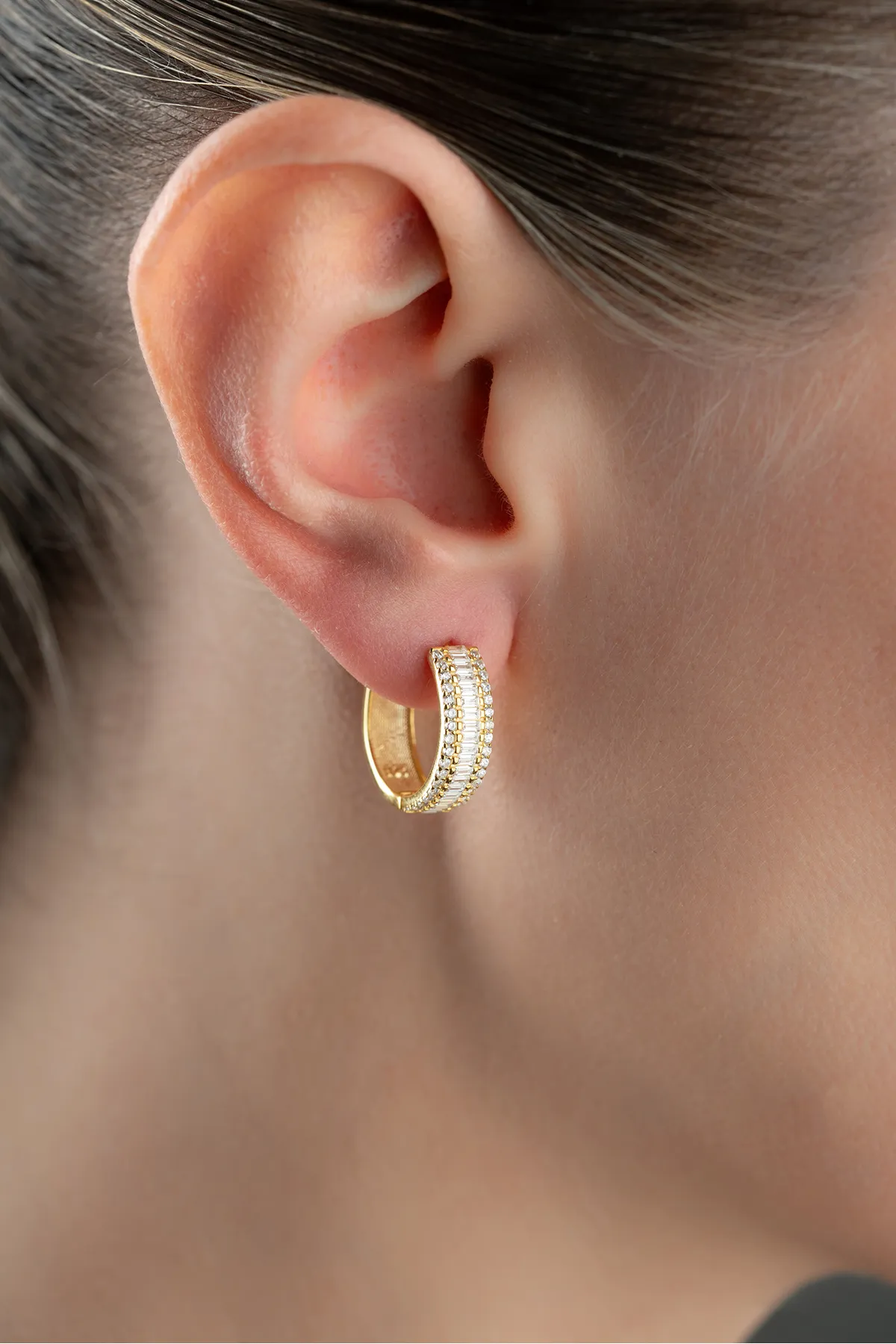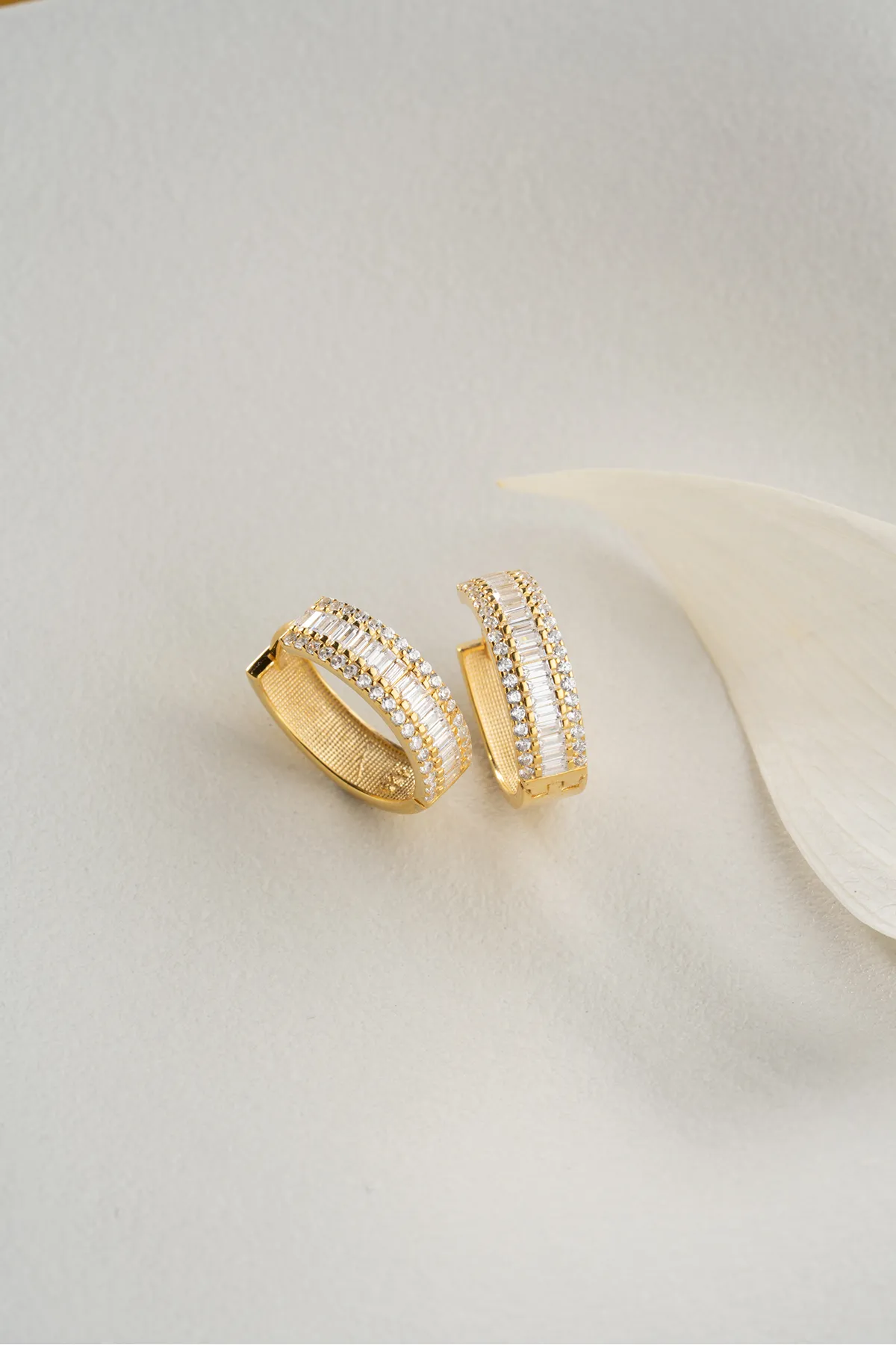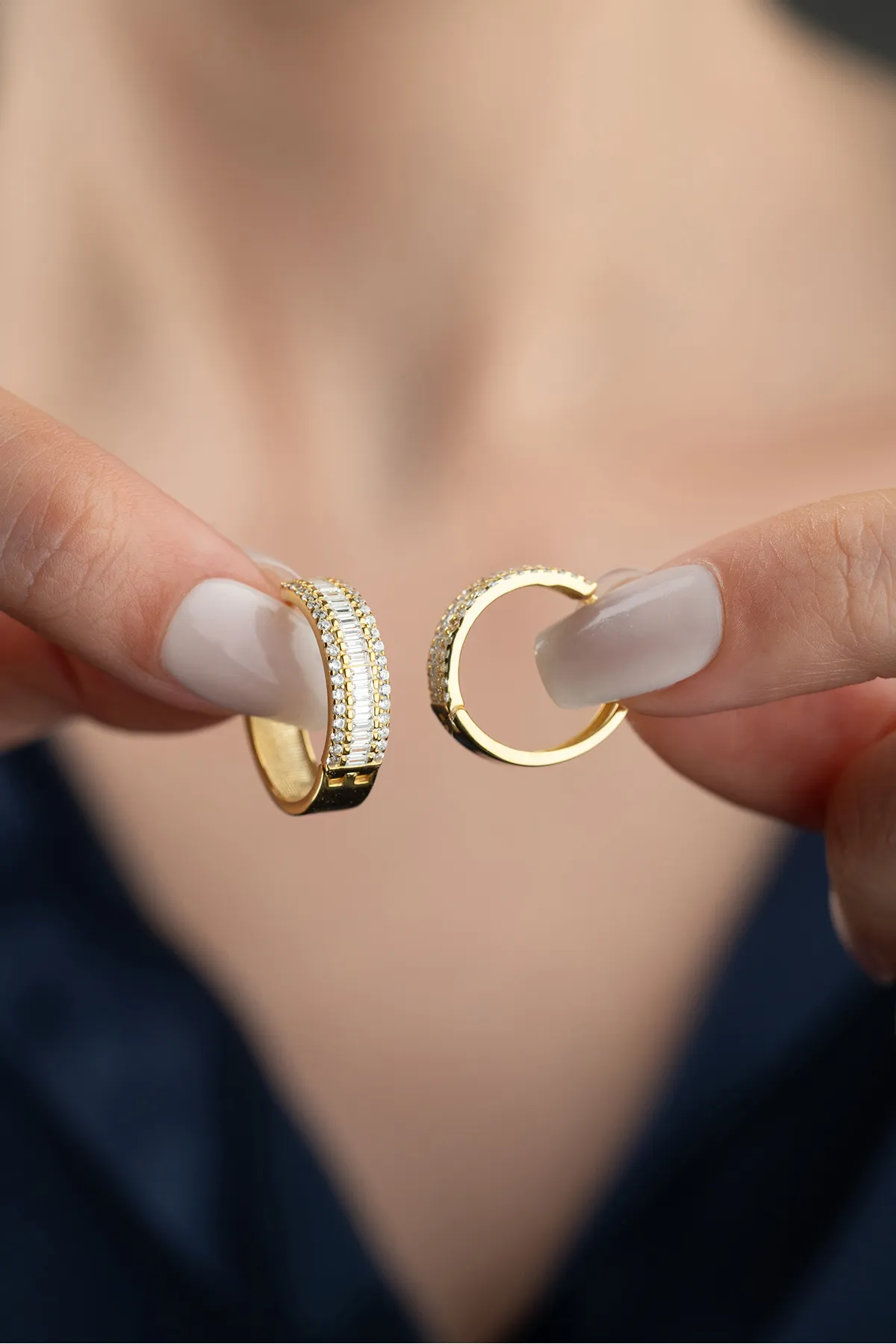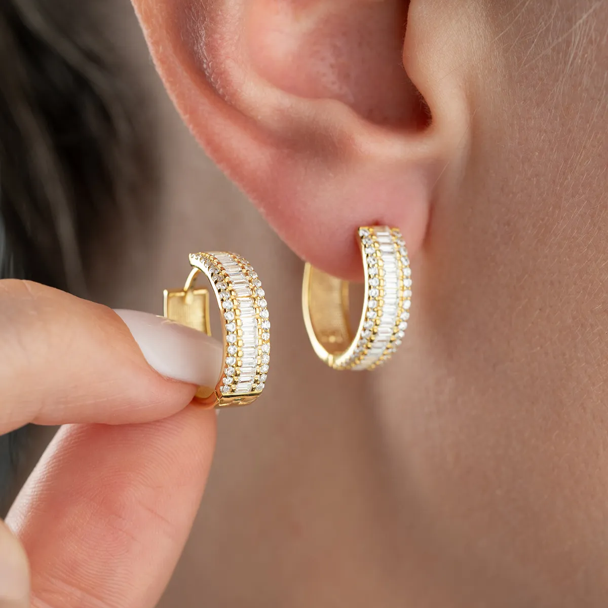 These dazzling baguette earrings, with their three rows of stones, are crafted from 925 sterling silver and enriched with gold plating. The epitome of elegance for special occasions.