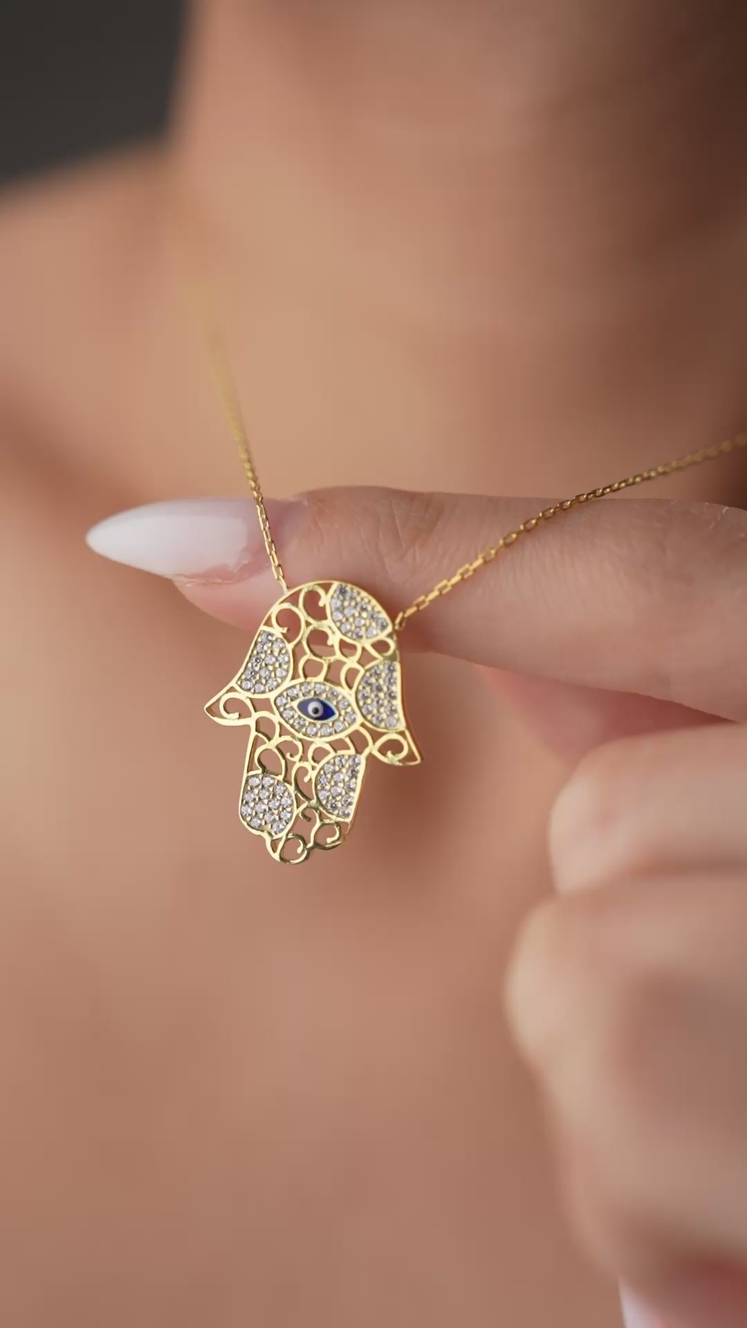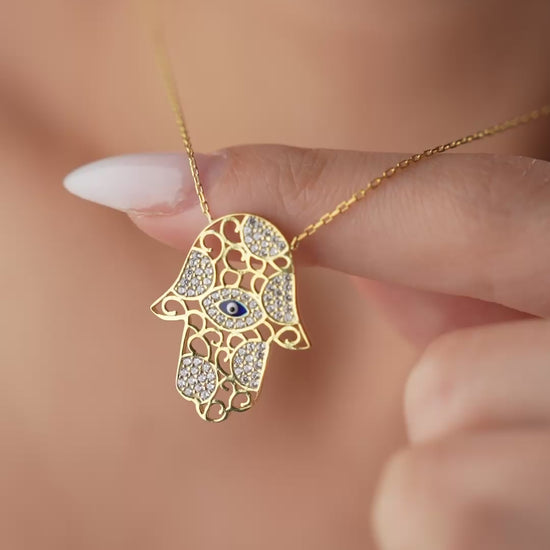 925 sterling silver necklace with evil eye bead detail and stone-engraved Hamsa hand figure.