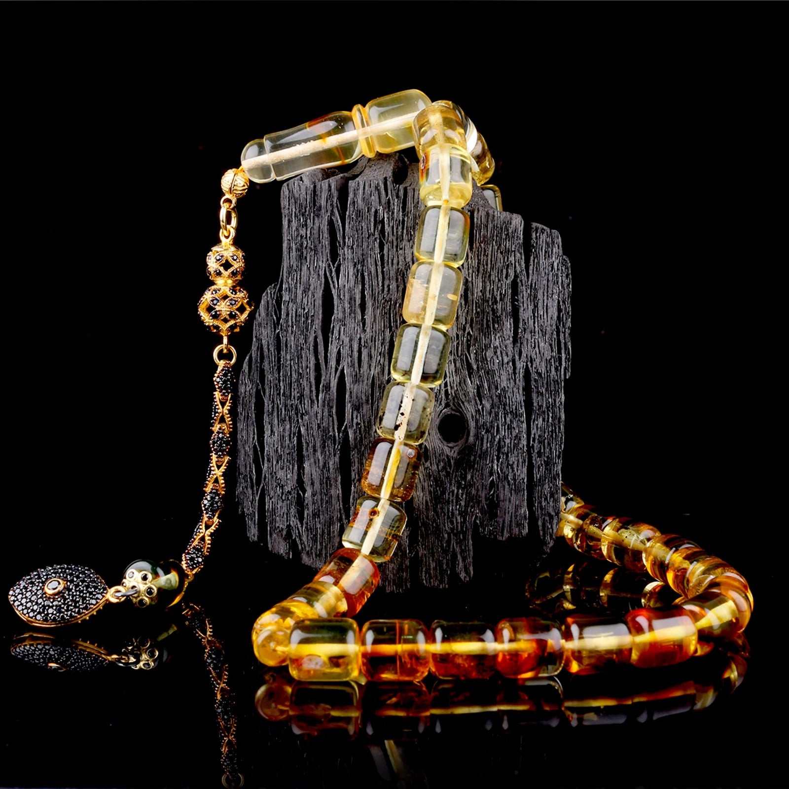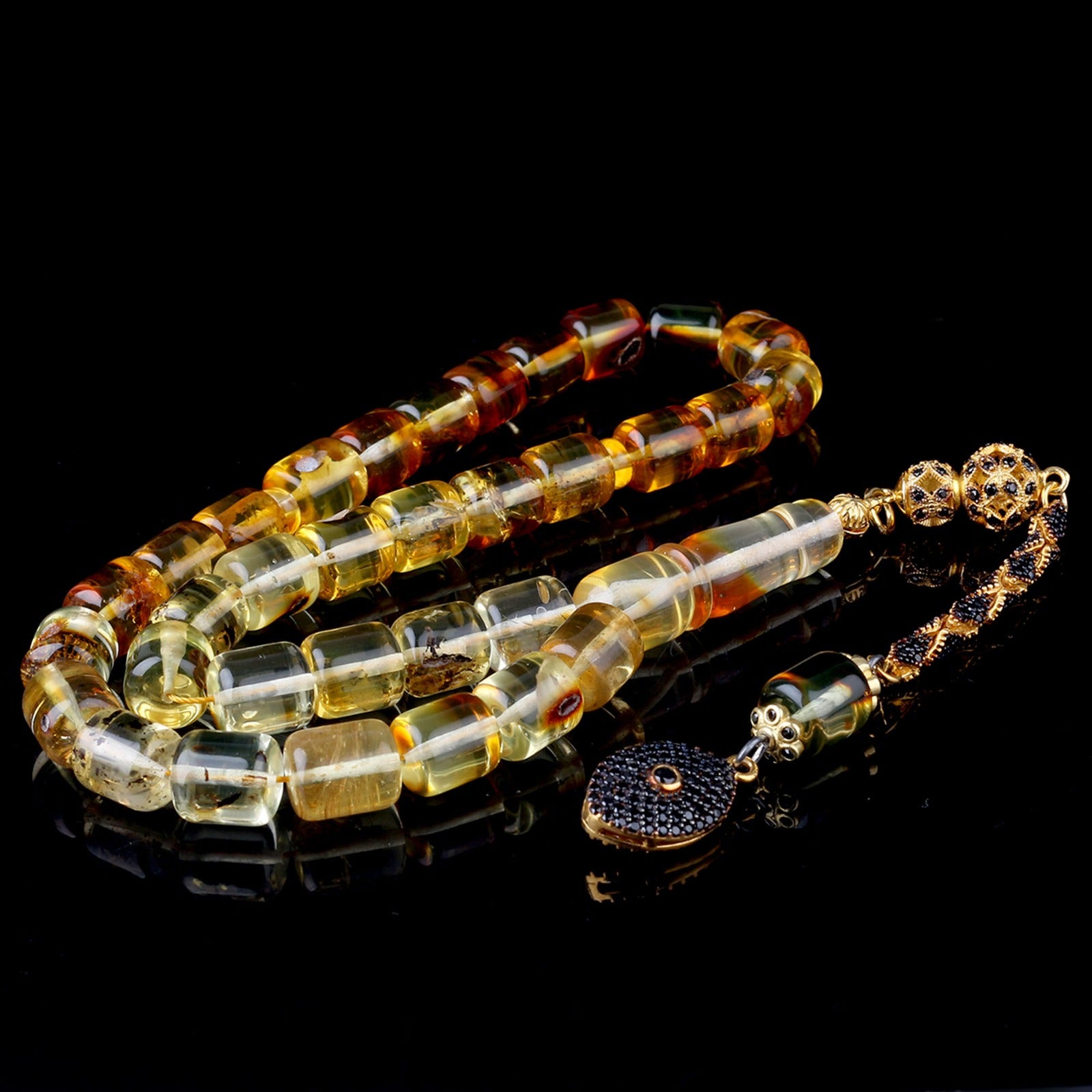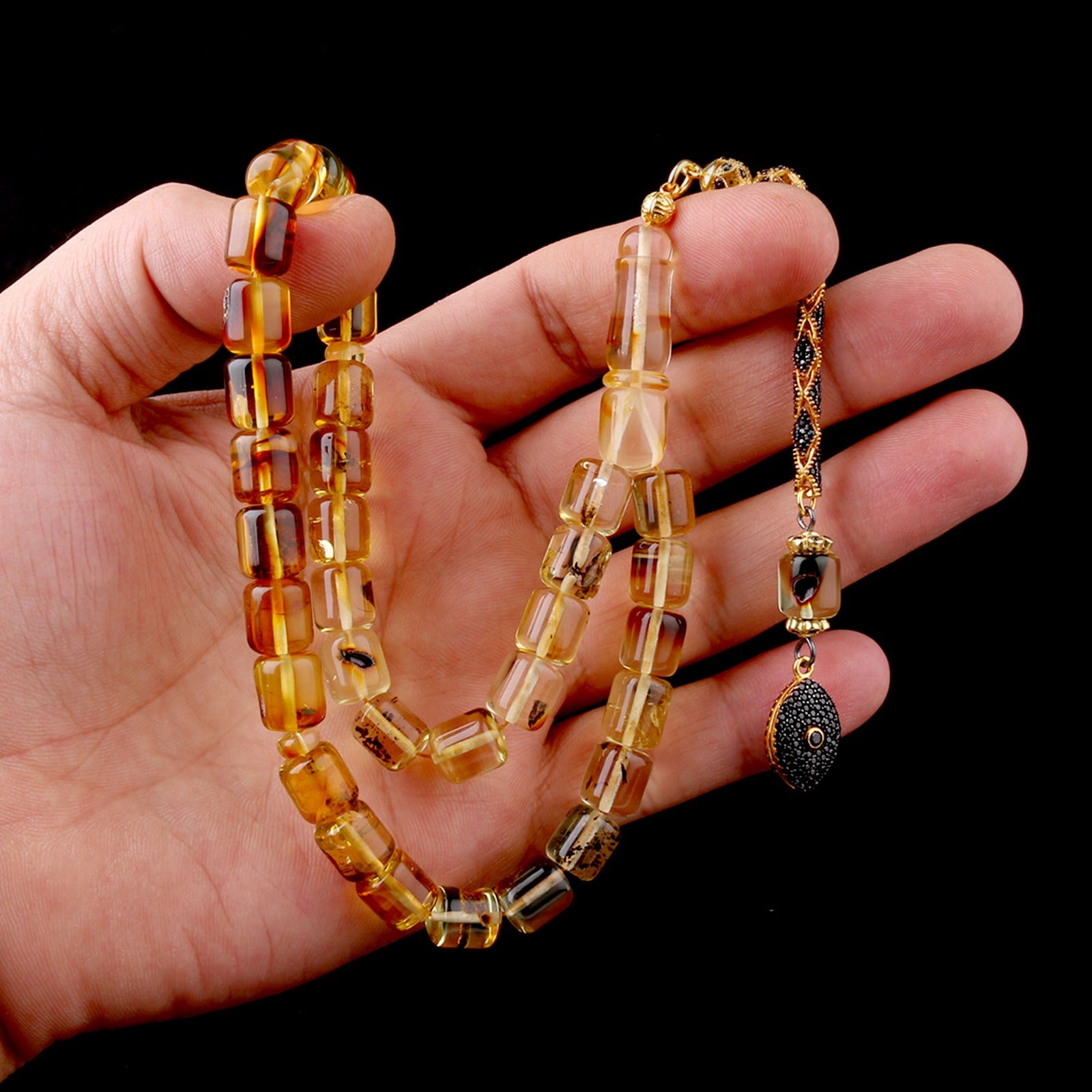 Kapsül Kesim Sarı-Siyah Damla Kehribar Tesbih