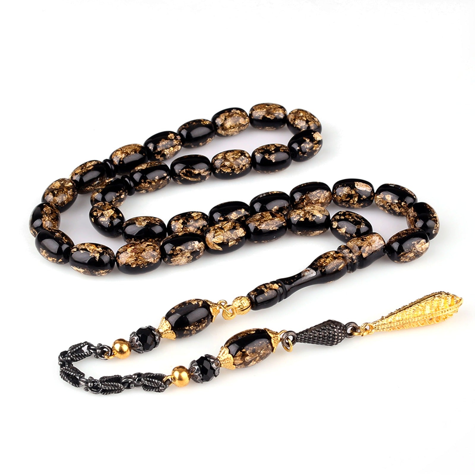 Metal bafon püsküllü, altın parça görünümlü hareli siyah sıkma kehribar tesbih.