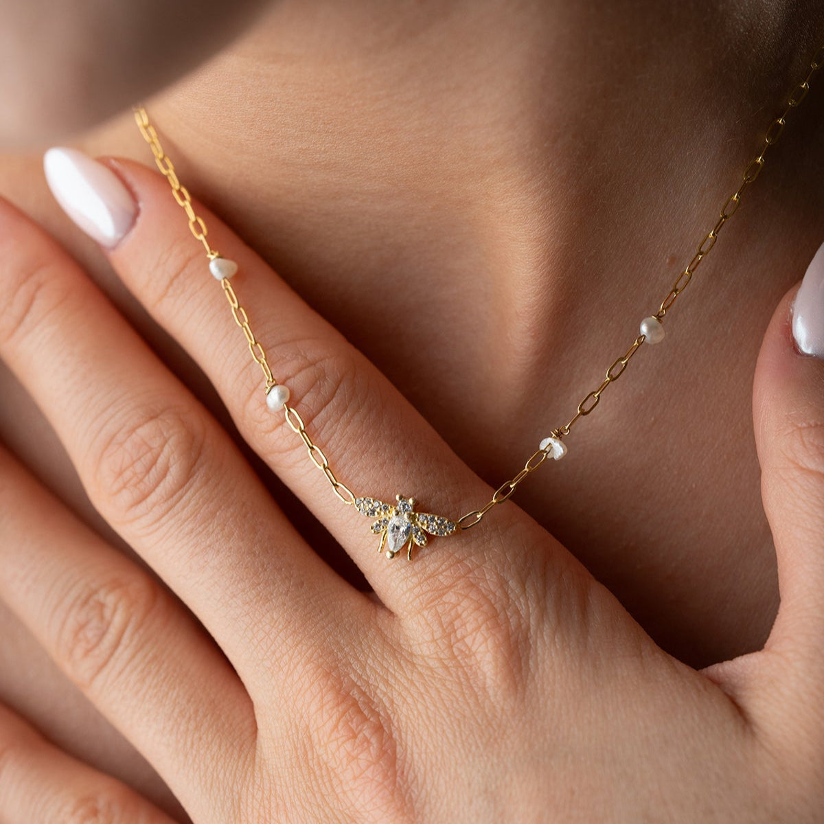 925 sterling silver necklace with a pearl detailed chain and a bee figure with zircon stones.