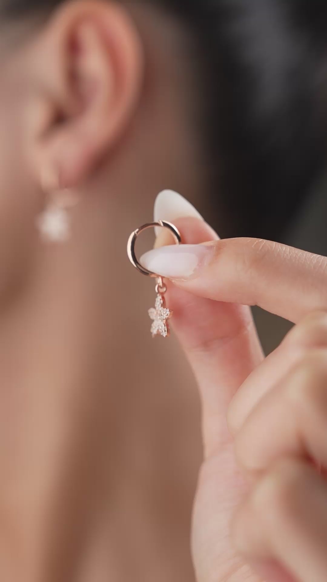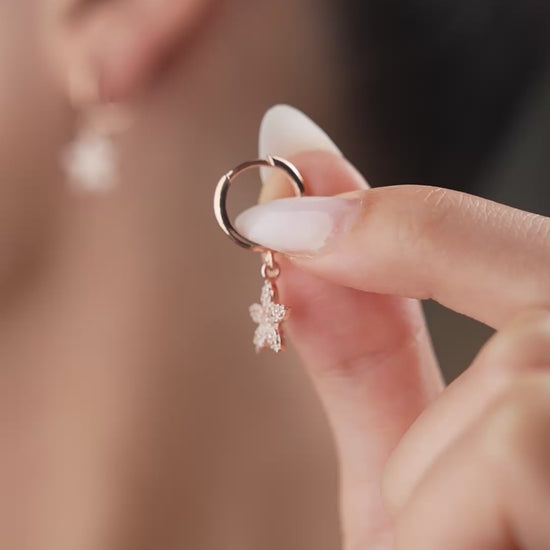 Elegant pink-toned hoop earrings with a flower shape adorned with sparkling stones.