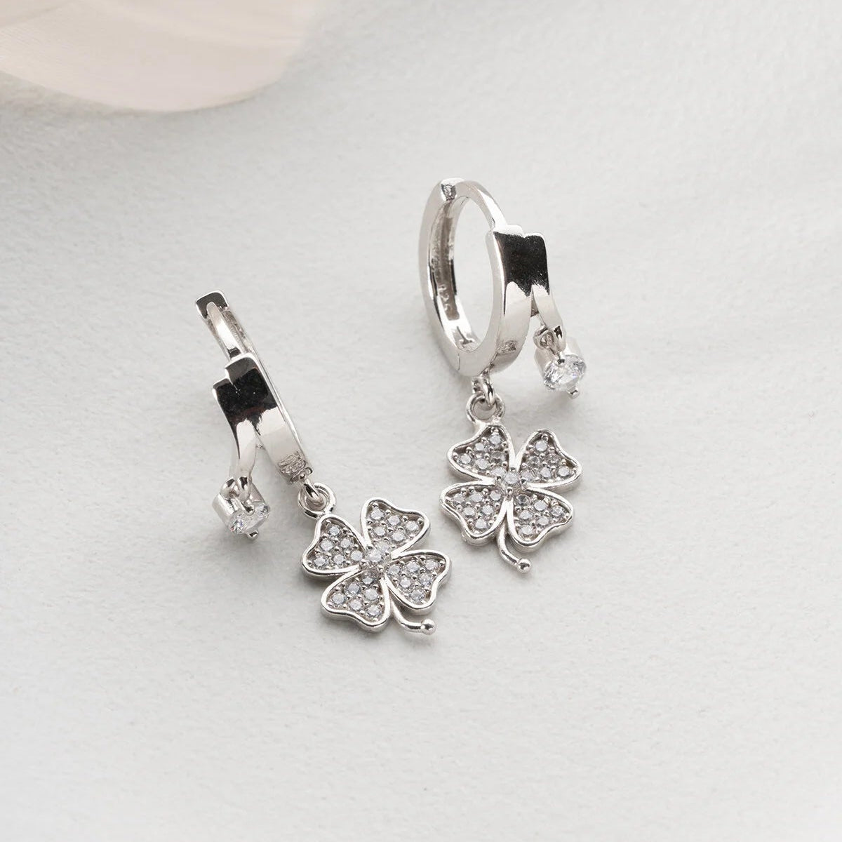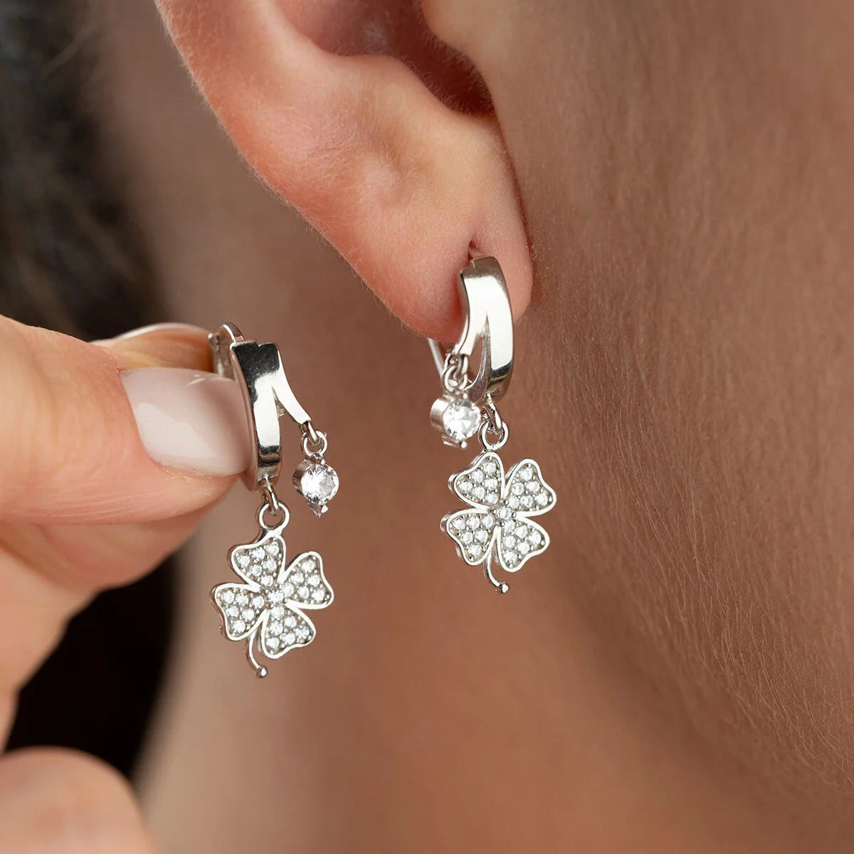 Şans sembolü dört yapraklı yonca tasarımıyla 925 ayar gümüş sallantılı küpe modeli.