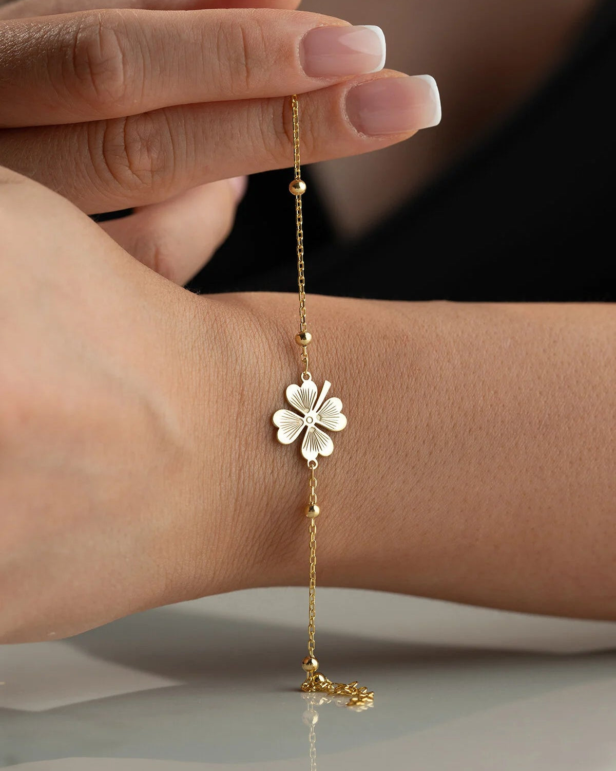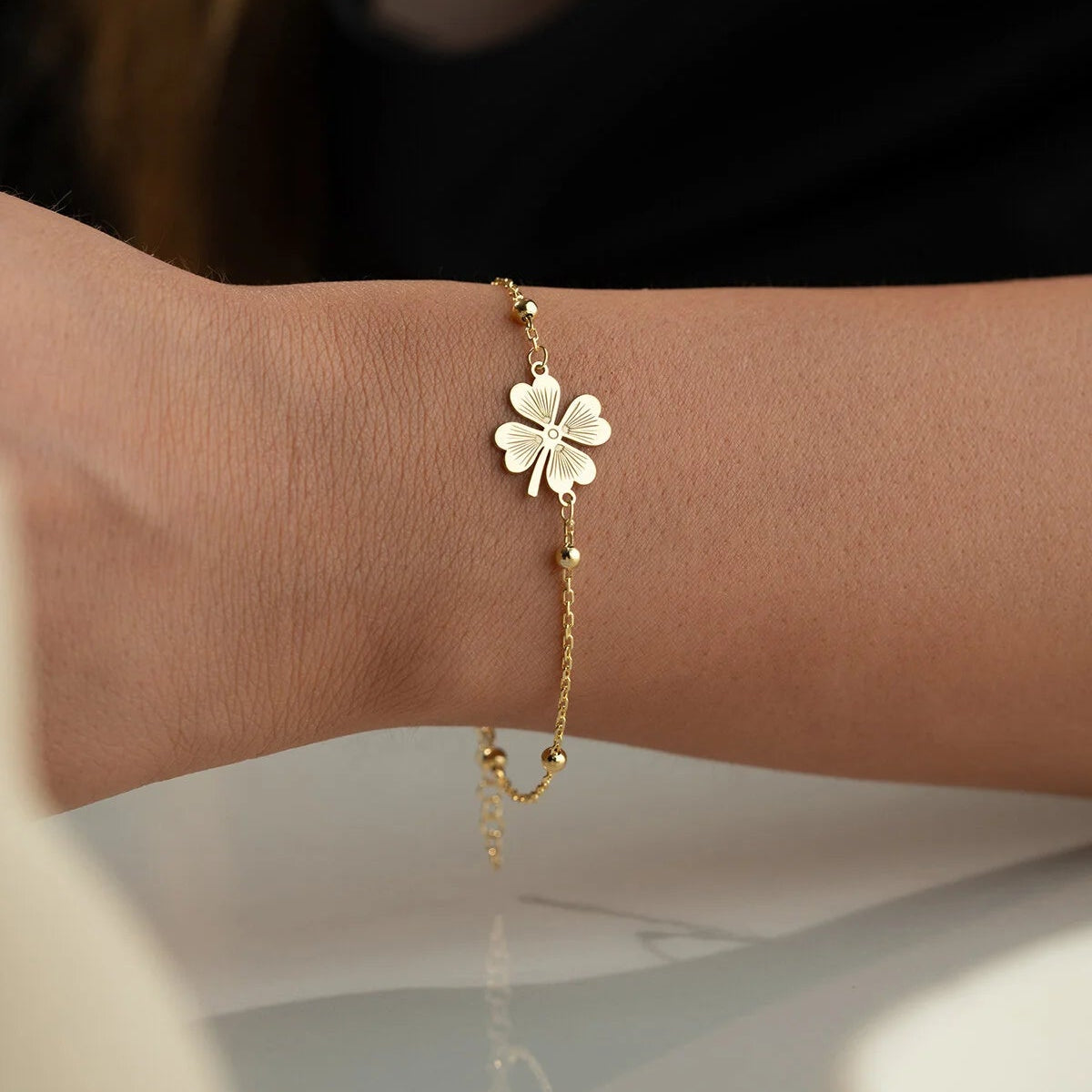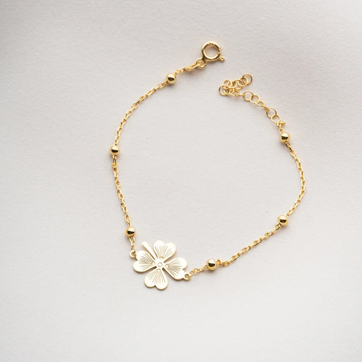 Şans getiren zarif yonca detaylı, 925 ayar gümüş altın kaplama bileklik.