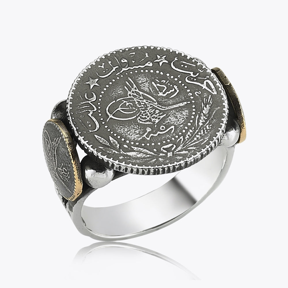 Tarihi Osmanlı tuğrası ve madeni para görünümüyle tasarlanmış 925 ayar gümüş erkek yüzük.