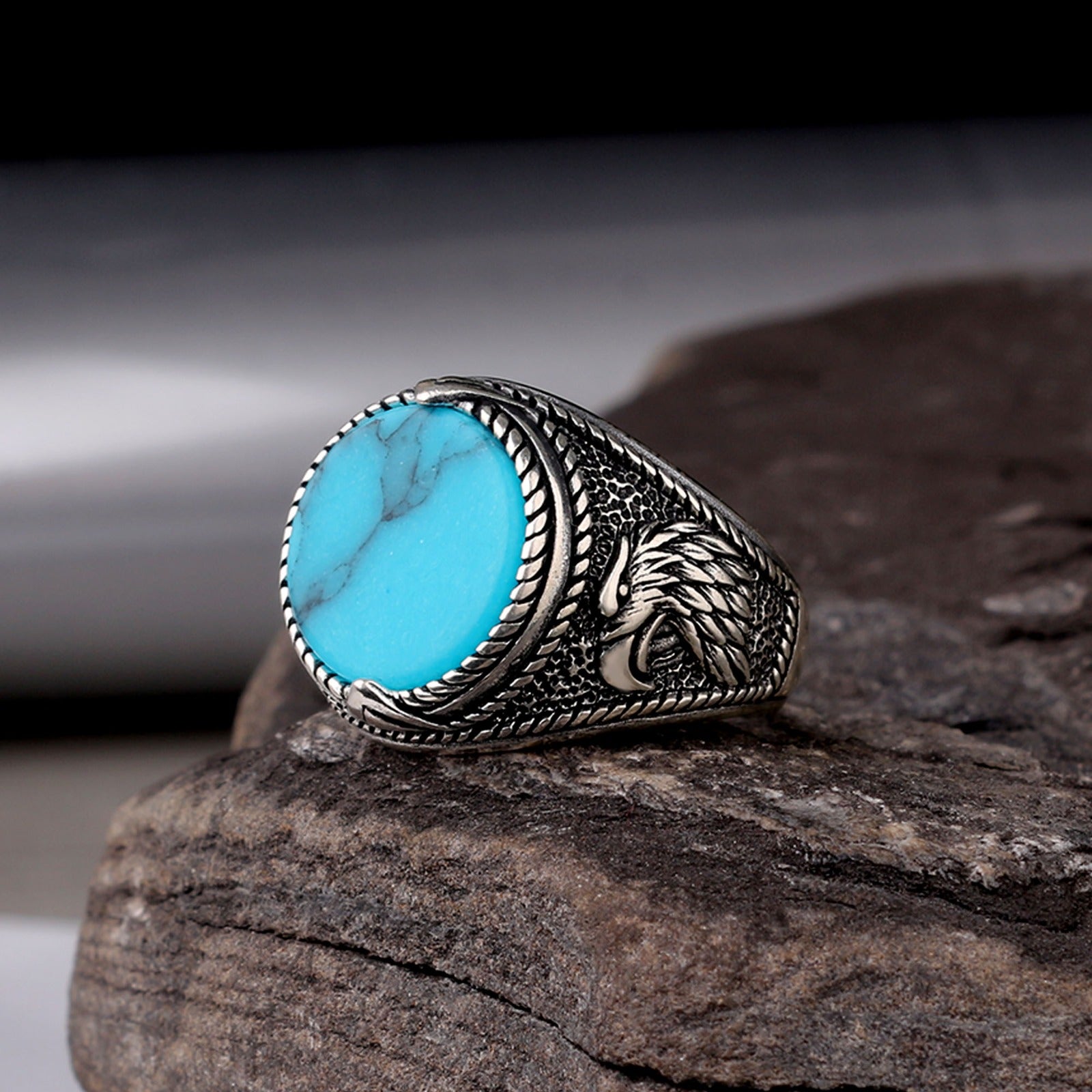 Bague pour homme ornée d'un aigle et sertie de turquoise, symbole de naturel et de liberté.