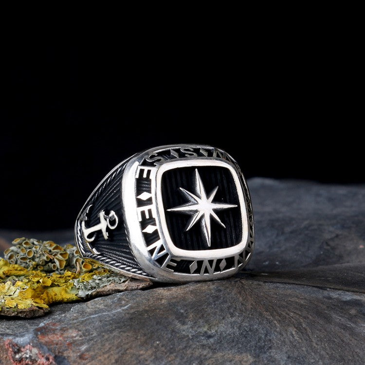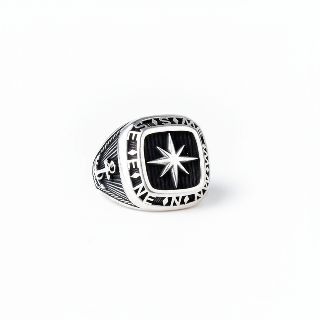 Depuis des siècles, l'étoile polaire est un phare pour les voyageurs et les marins en quête de direction. Cette bague se distingue par sa signification symbolique et la finesse de son travail. L'étoile brillante sur fond sombre symbolise la détermination et une vie déterminée. L'ancre argentée sur le côté symbolise la loyauté et la force.