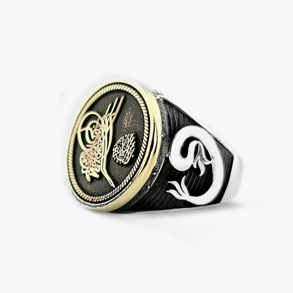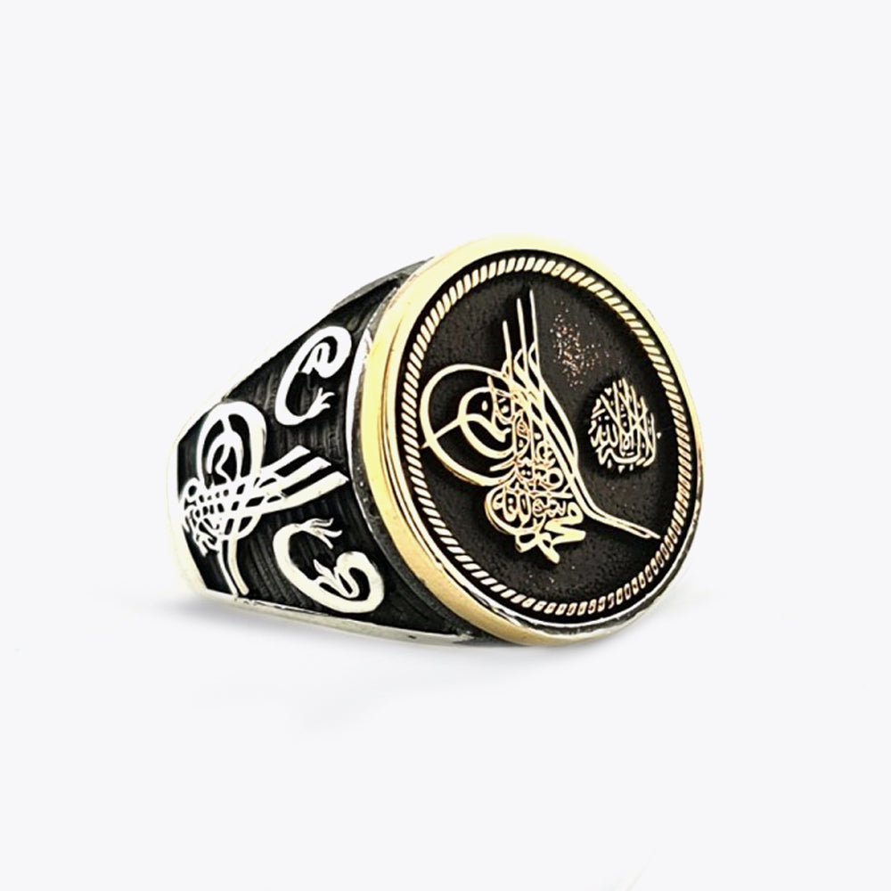 Altın renk çerçeveli yuvarlak yüzeyde Osmanlı tuğrası ve hat yazılı 925 ayar gümüş erkek yüzük.