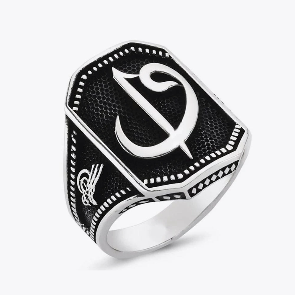 Vav harfi, Osmanlı tuğrası ve siyah zemin detayıyla tasarlanmış 925 ayar gümüş erkek yüzük.