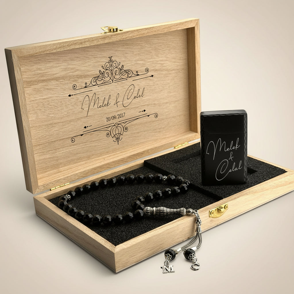 L'ensemble chapelet en pierre d'onyx de 8 mm et briquet en acier personnalisé est une option cadeau élégante avec son image en argent sterling 925 et ses détails de pompon. Présenté dans un coffret en bois avec notes.