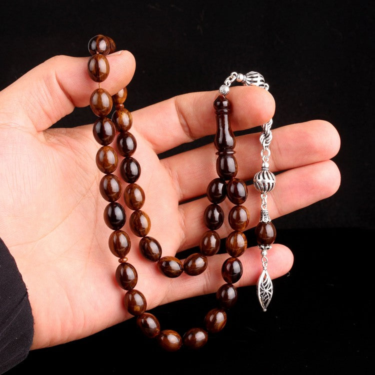 925 ayar gümüş püsküllü kahverengi ateş kehribar tesbih. 9x11,5 mm taneli ve 35 cm tam boyuyla şık, elde rahat kullanım sunar.