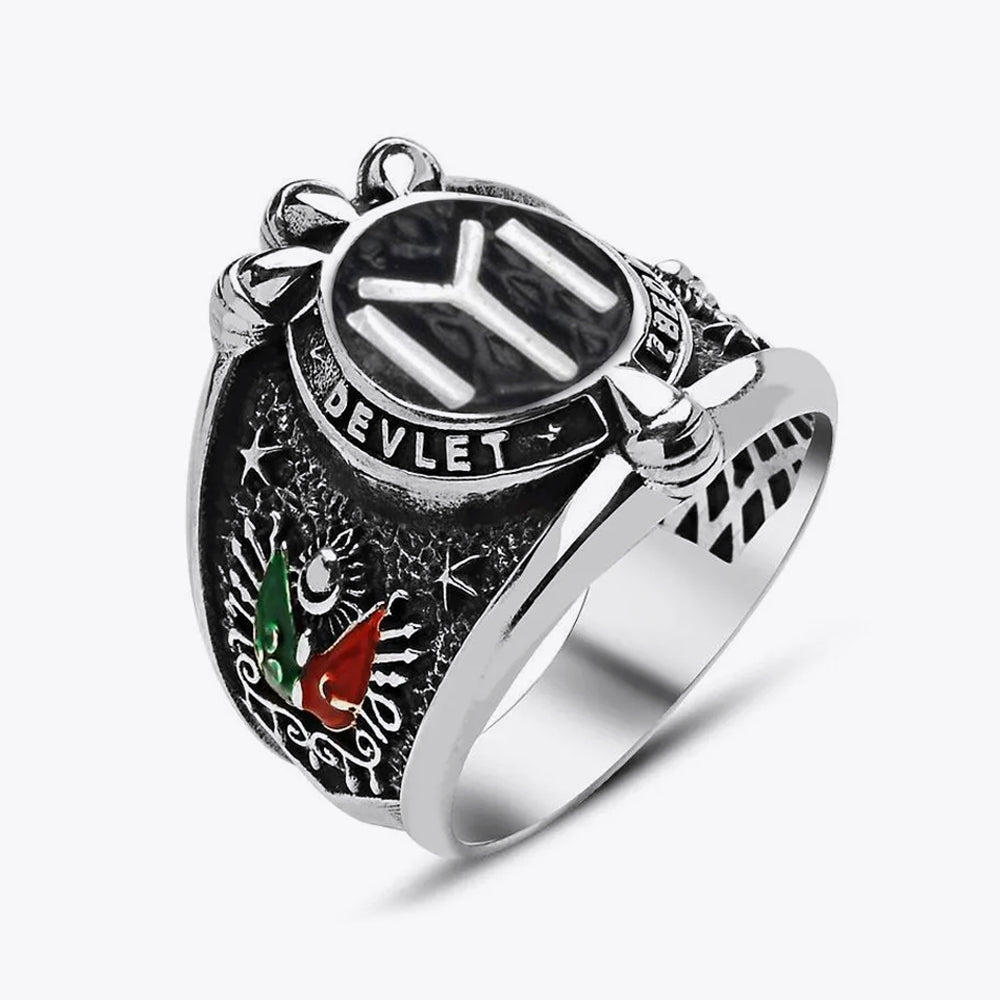 Üzerinde Kayı boyu sembolü, "Devlet" yazısı ve Türk bayrağı detayı bulunan 925 ayar gümüş yüzük.