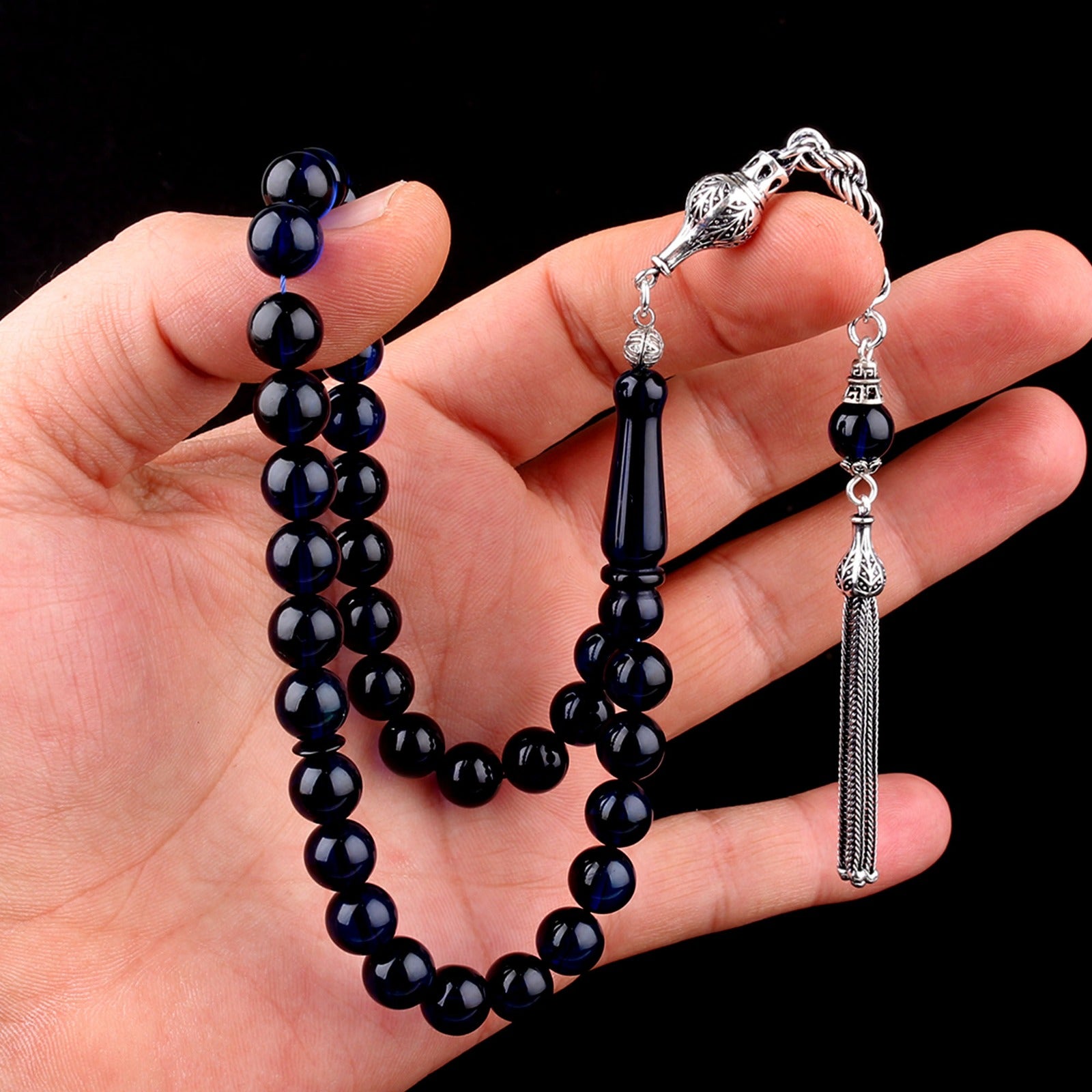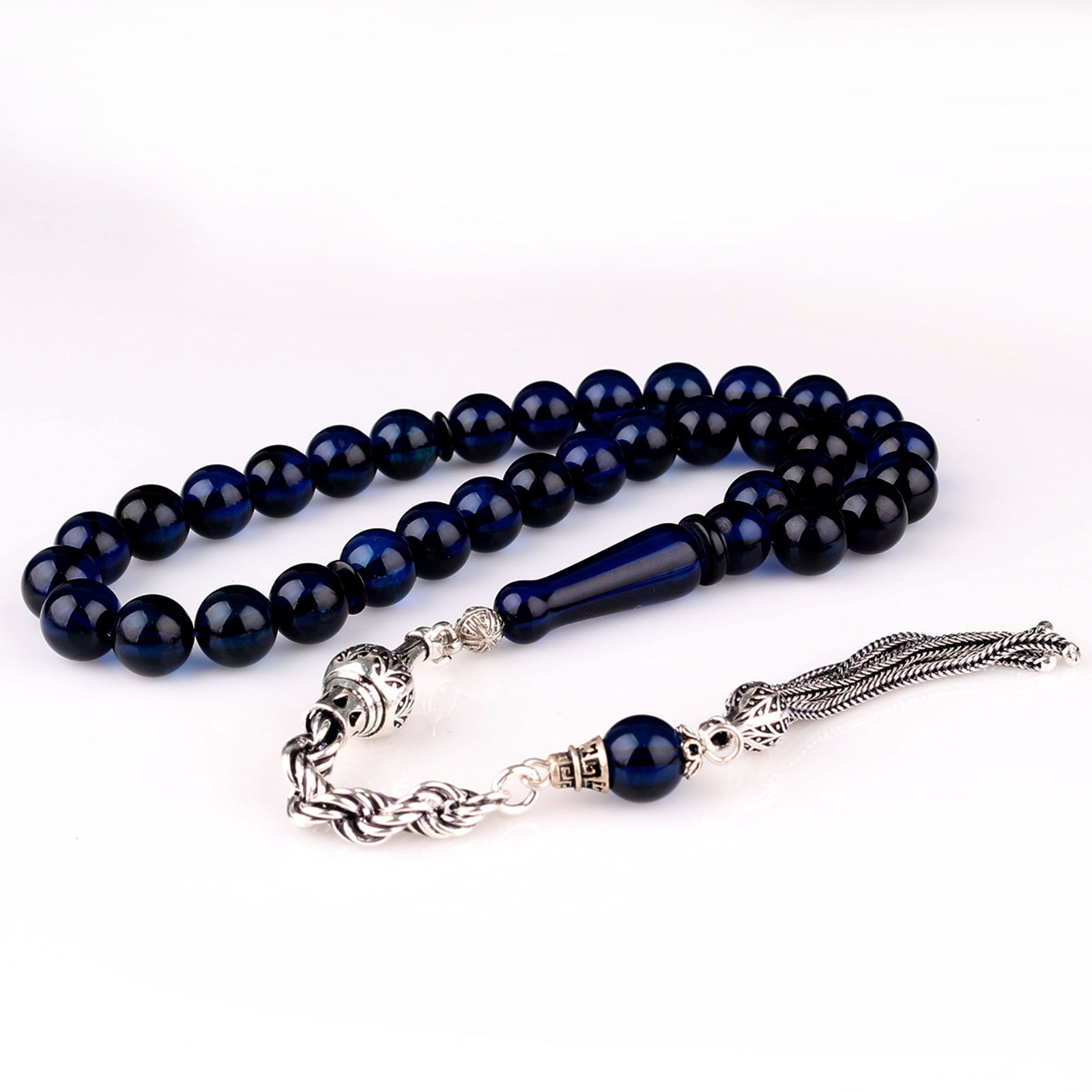925 ayar gümüş püsküllü, orijinal ve sertifikalı parlament mavisi damla kehribar tesbih.