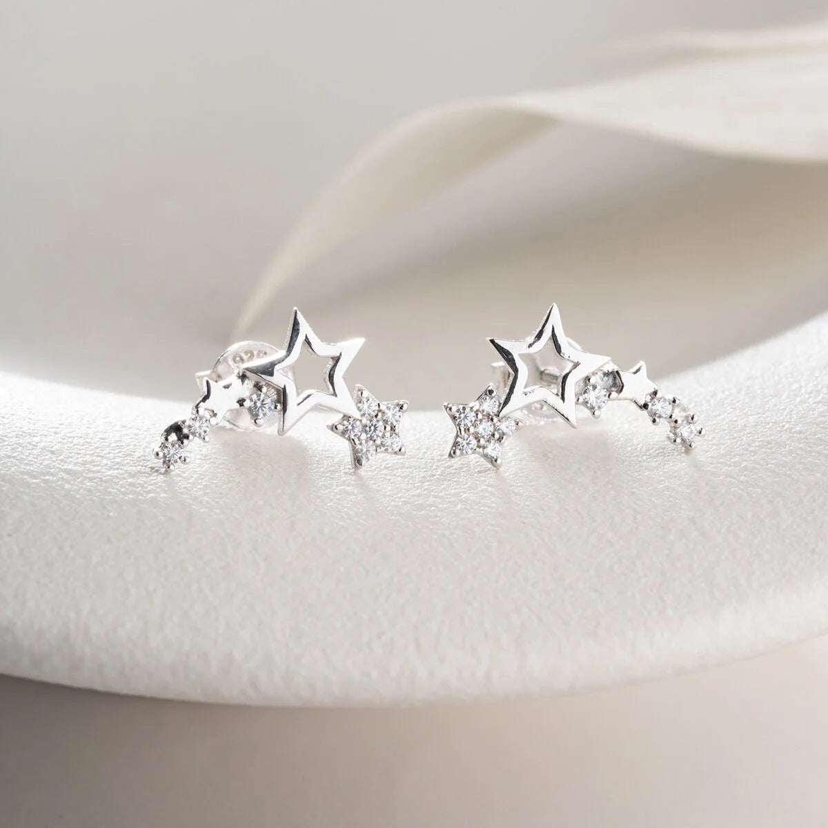 Parlak taşlarla süslenmiş modern yıldız tasarımlı 925 ayar gümüş küpe.