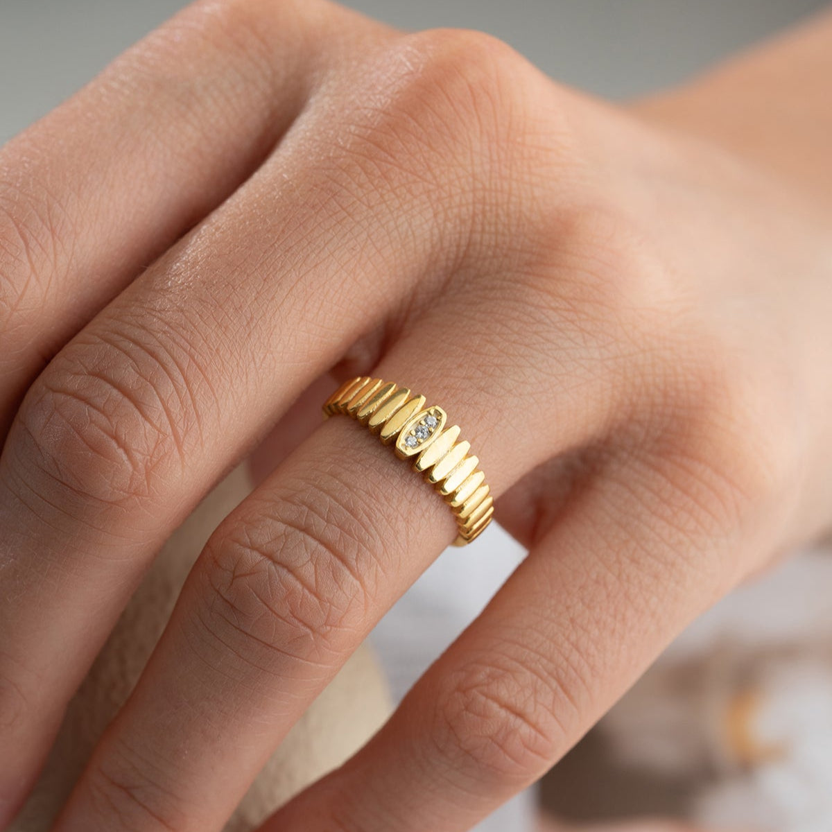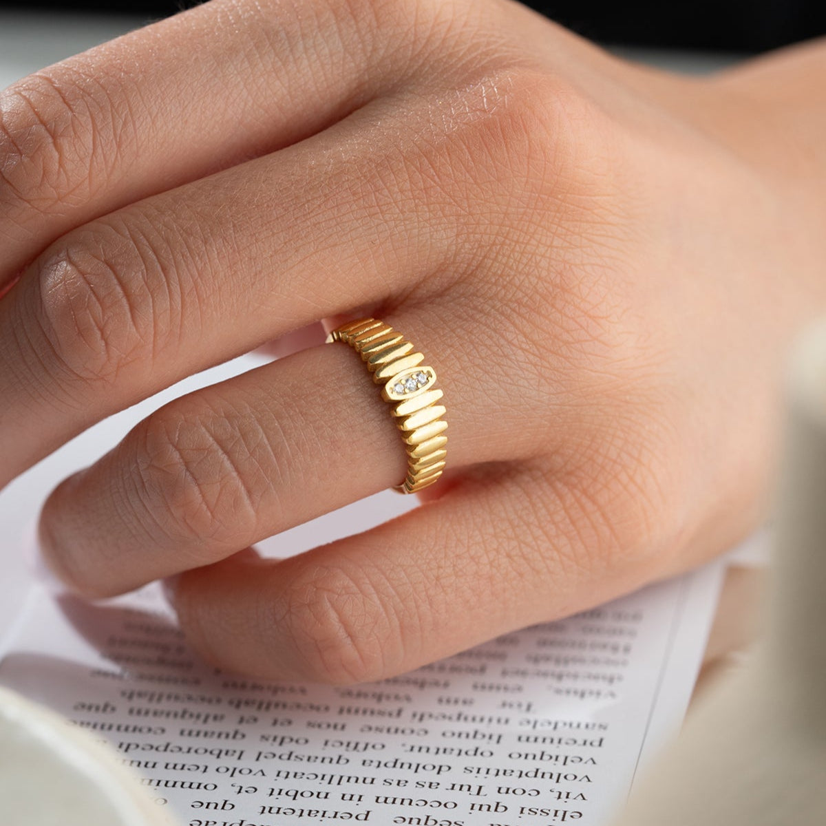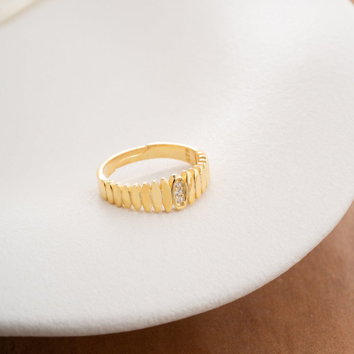 Une élégante bague plaquée or au design moderne. Sa pierre scintillante au centre ajoute une touche sophistiquée à votre élégance. Idéale au quotidien comme pour les grandes occasions.