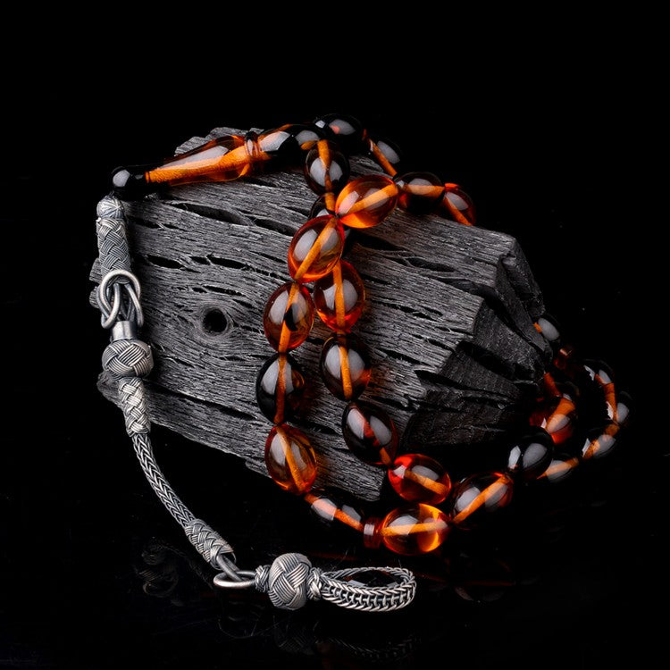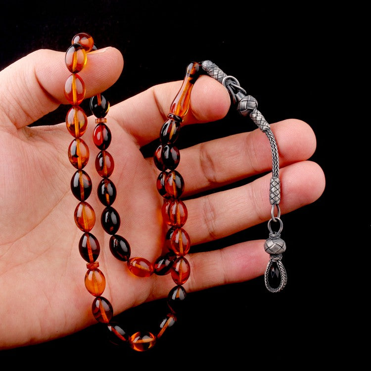 1000 Ayar Gümüş Püsküllü Arpa Kesim Karışık Renk Ateş Kehribar Tesbih