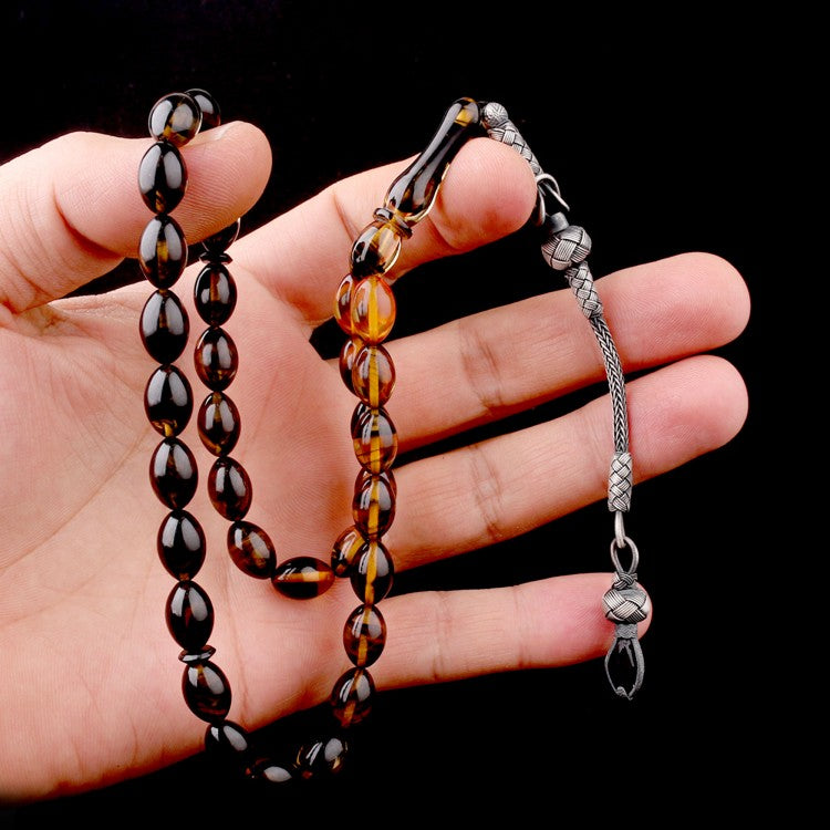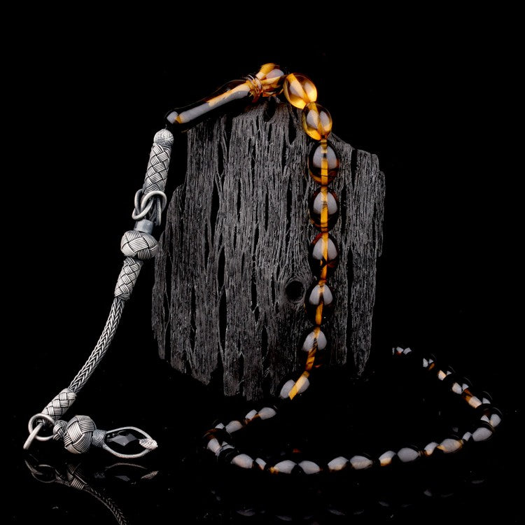 Sarı ve siyah renk geçişli, süzme model arpa kesim kehribar tesbih.