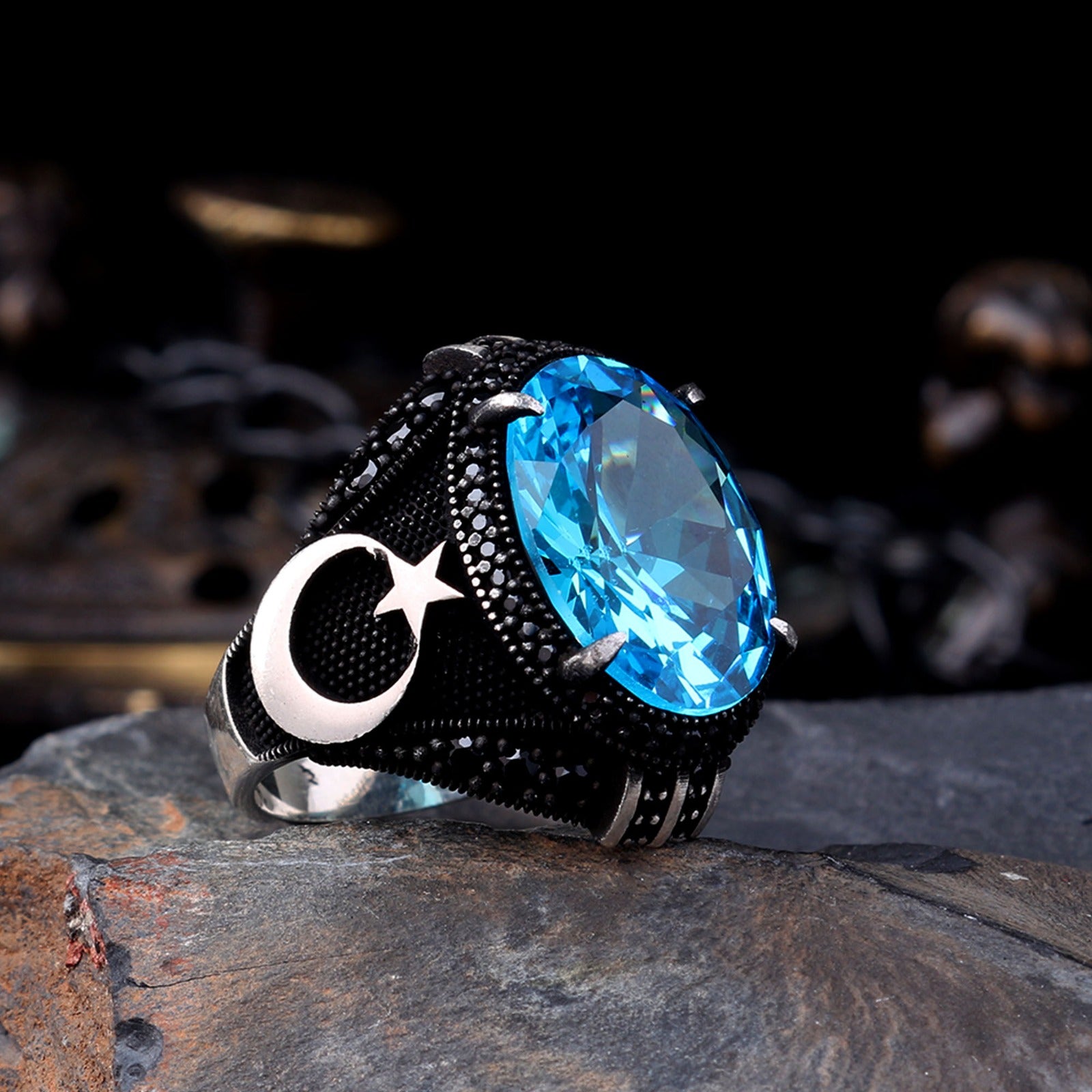 Parlak aqua marin zirkon taş ve zarif ayyıldız motifiyle tasarlanmış 925 ayar gümüş erkek yüzük.