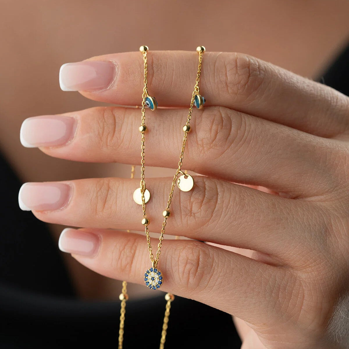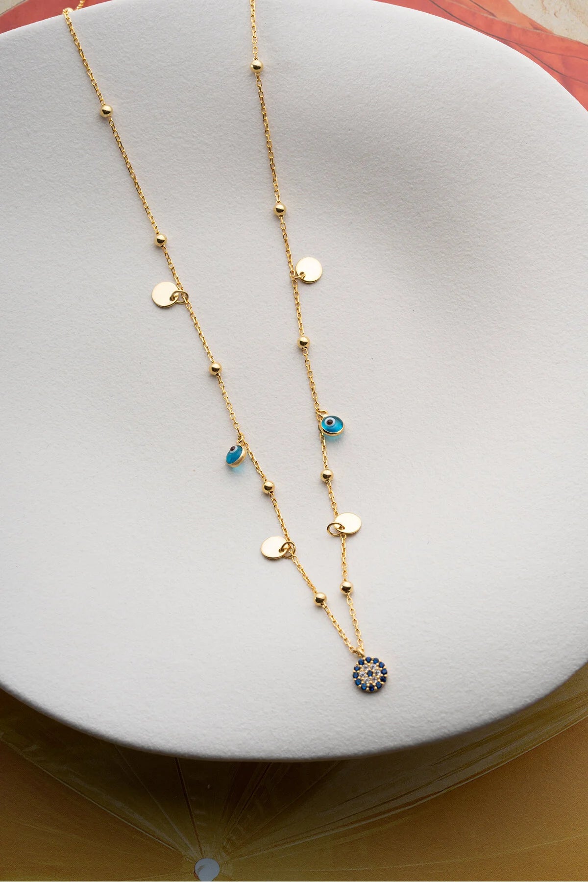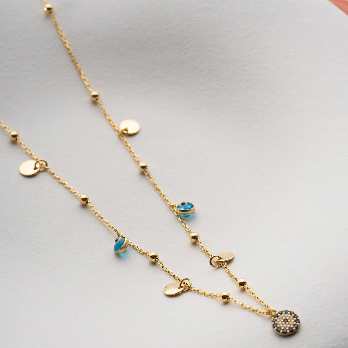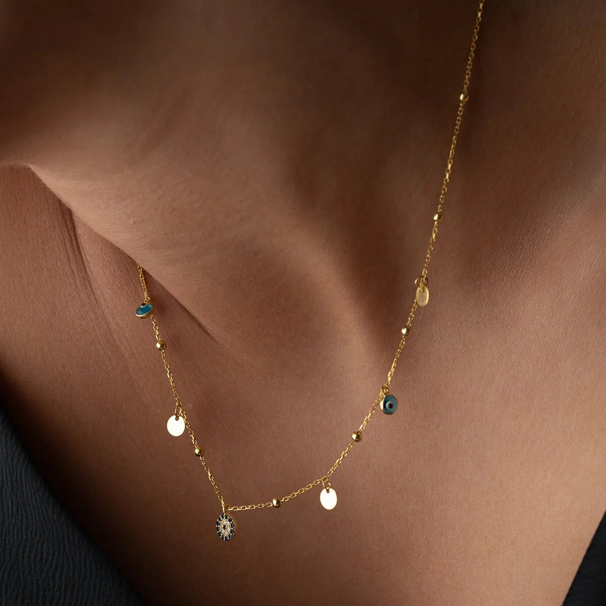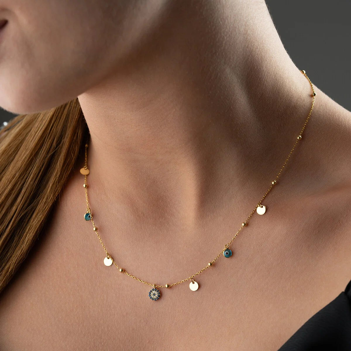 Şans getiren nazar boncuğu ve zarif detaylı altın kaplama kolye modeli.