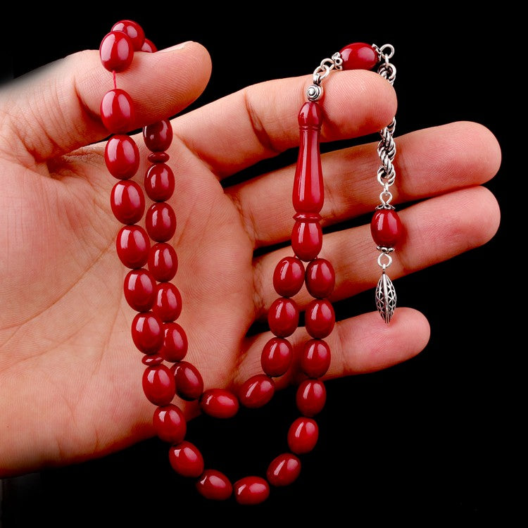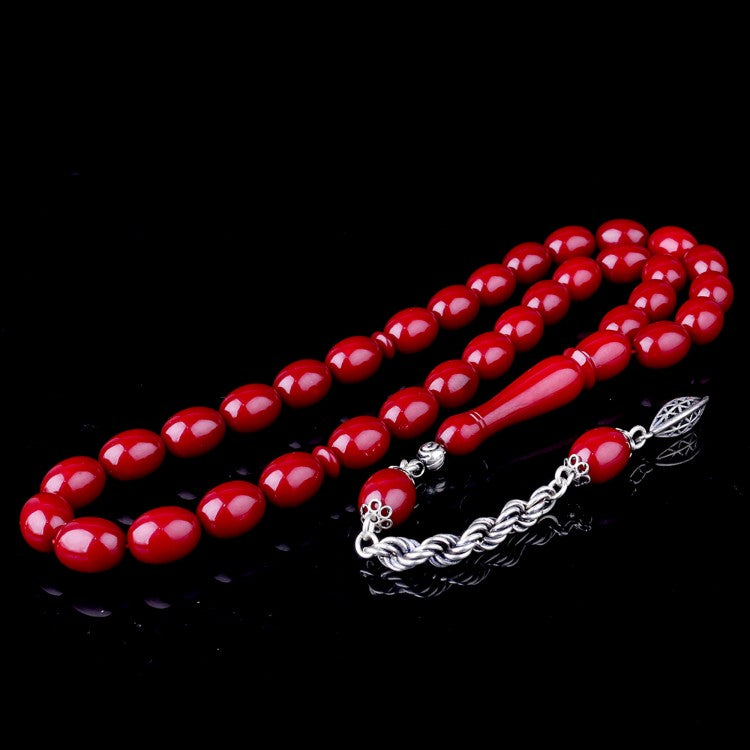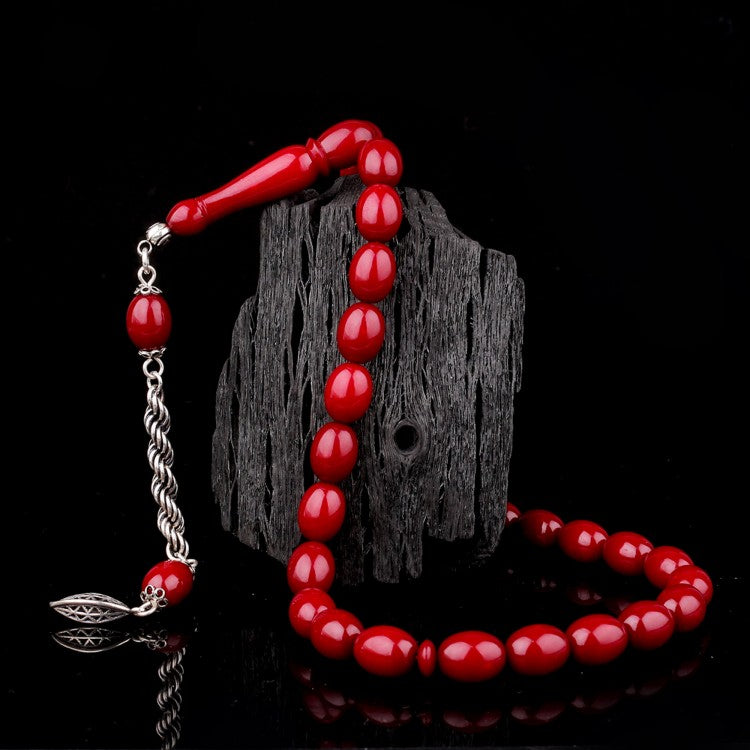 925 ayar gümüş püsküllü bordo ateş kehribar tesbih. Şık duruşu ve zarif tasarımıyla günlük kullanım ve hediye için ideal.