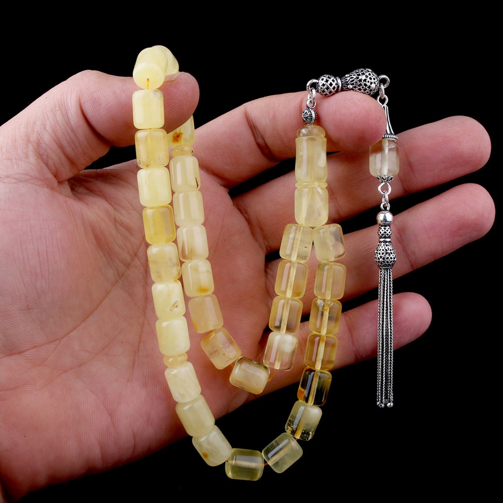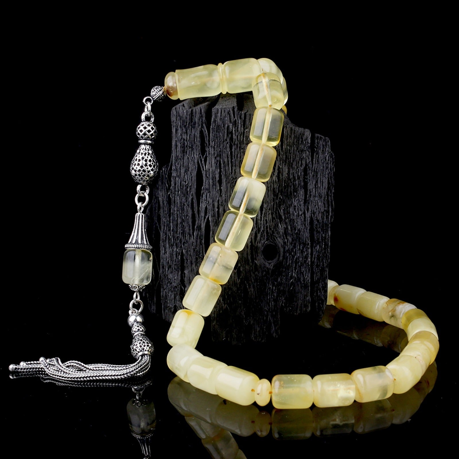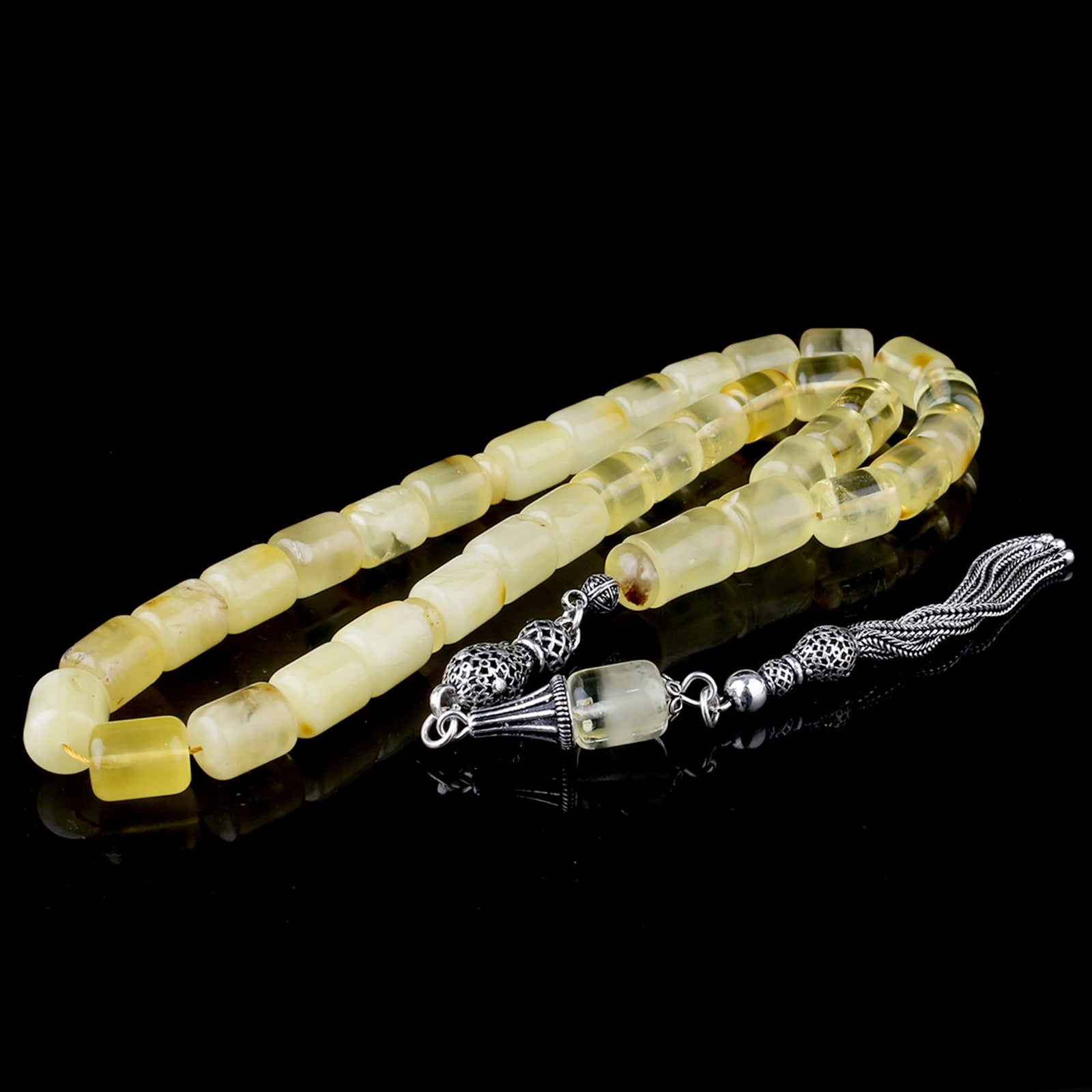 Mat sarı damla kehribar taneli, 925 ayar gümüş püsküllü, orijinal ve sertifikalı özel tesbih.