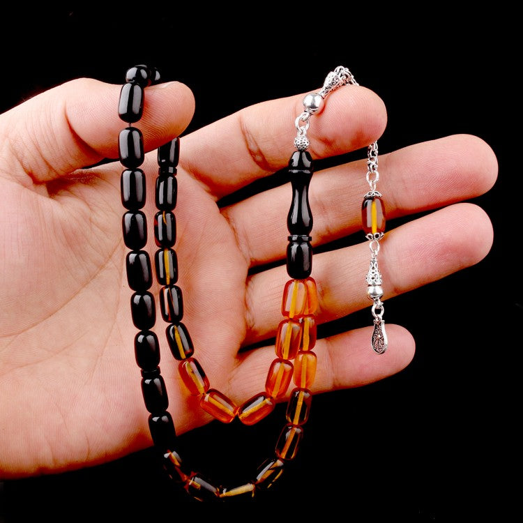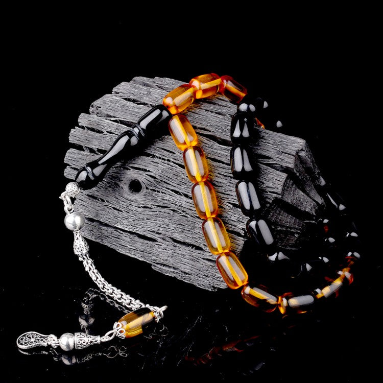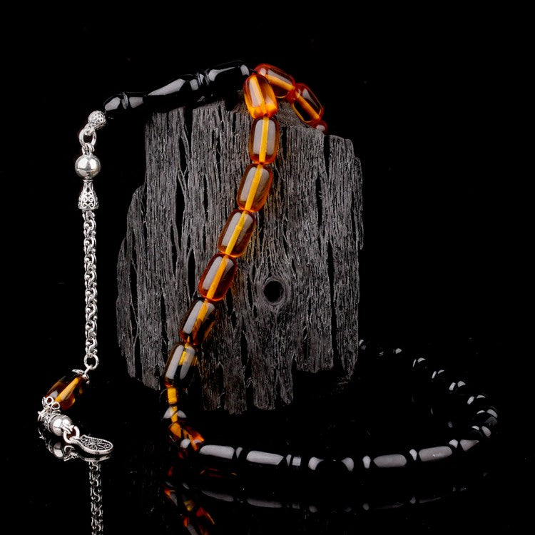 Sarı ve siyah renklerde kapsül kesim, zarif süzme model ateş kehribar tesbih.