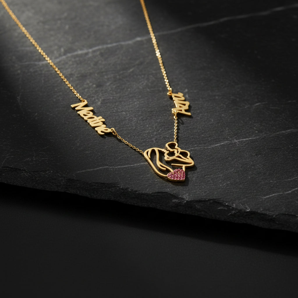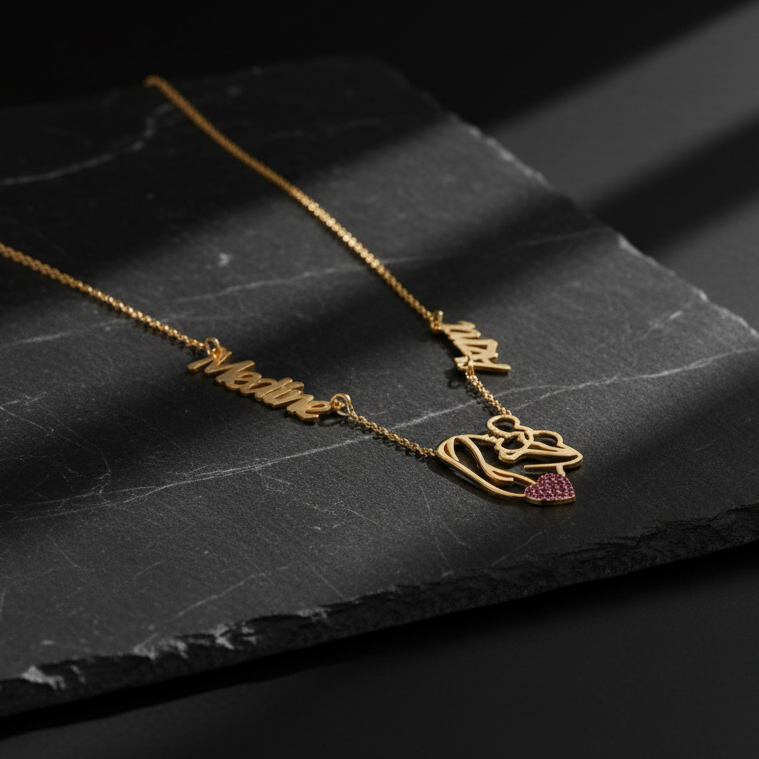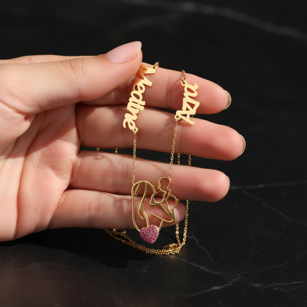 Anneler Günü için özel, anne bebek figürlü ve isim yazılı zarif kolye. Hollanda’da hazırlanır, hediye paketinde hızlı ve güvenli gönderilir.