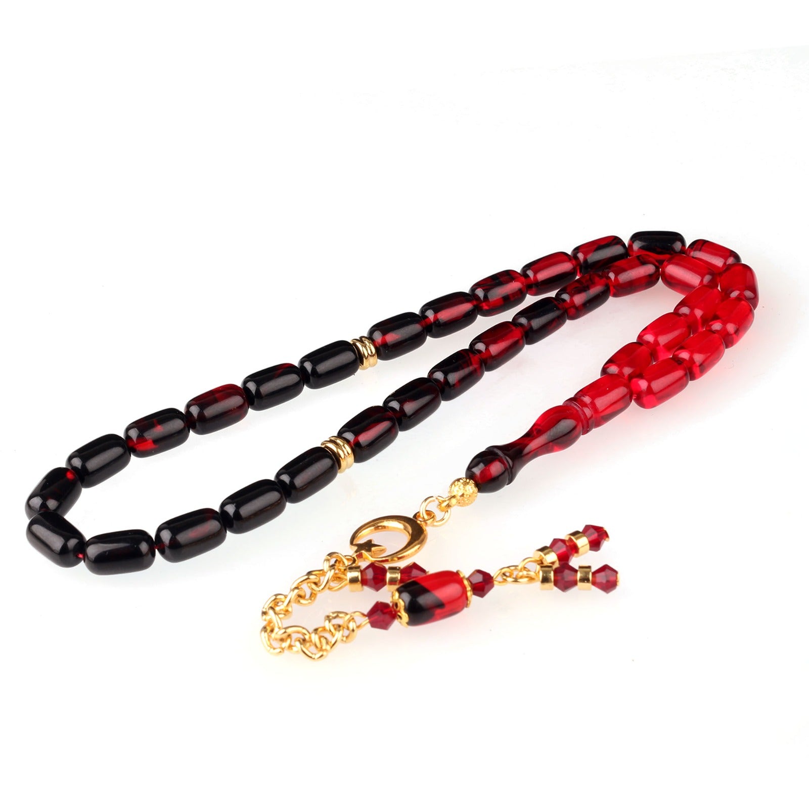 Kırmızı siyah geçişli ateş kehribar tesbih. Ay yıldız detaylı zincir püskülü ile şık ve dikkat çekici tasarım.