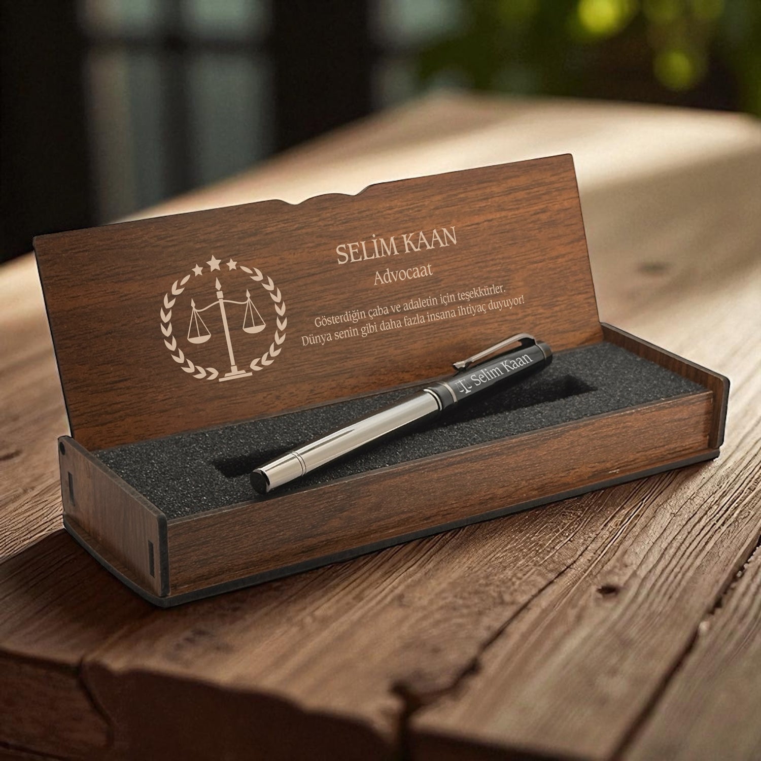 Adalet temalı, mesajlı ahşap kutuda, kişiye özel roller kalem. Şık ve anlamlı hediye seçeneği.