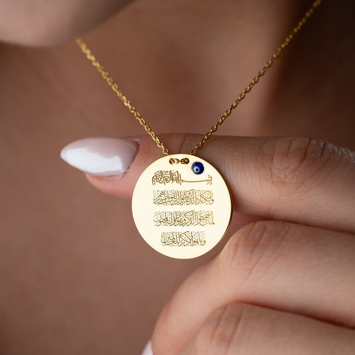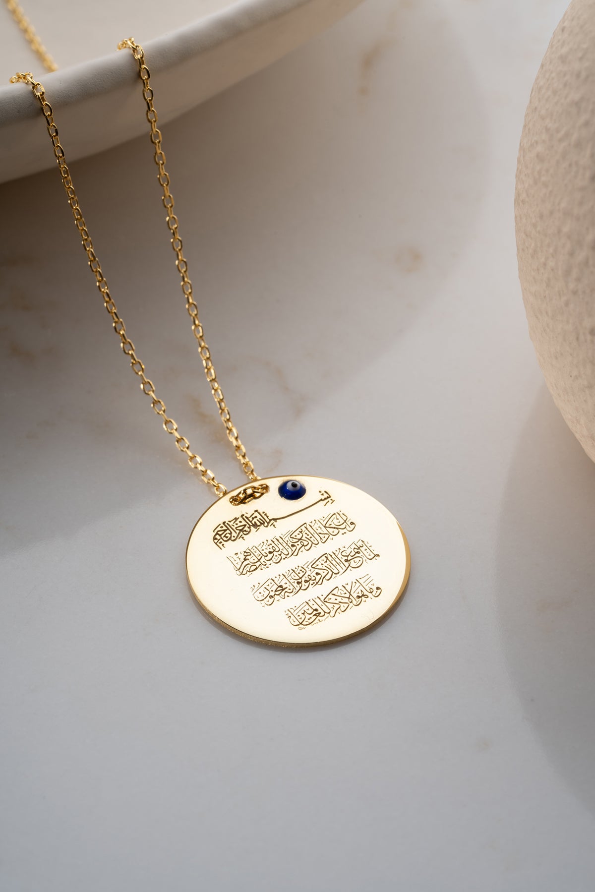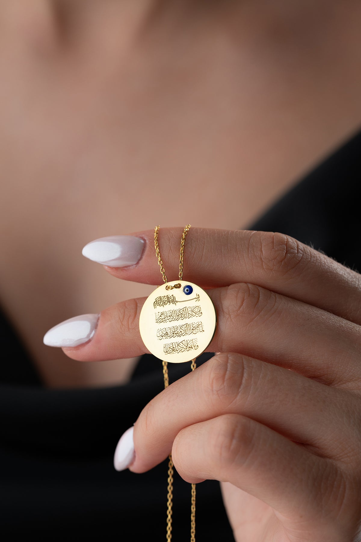 Ayetel Kürsi yazılı, nazar boncuk detaylı 925 ayar gümüş kolye. Manevi koruma ve zarif tasarım bir arada.