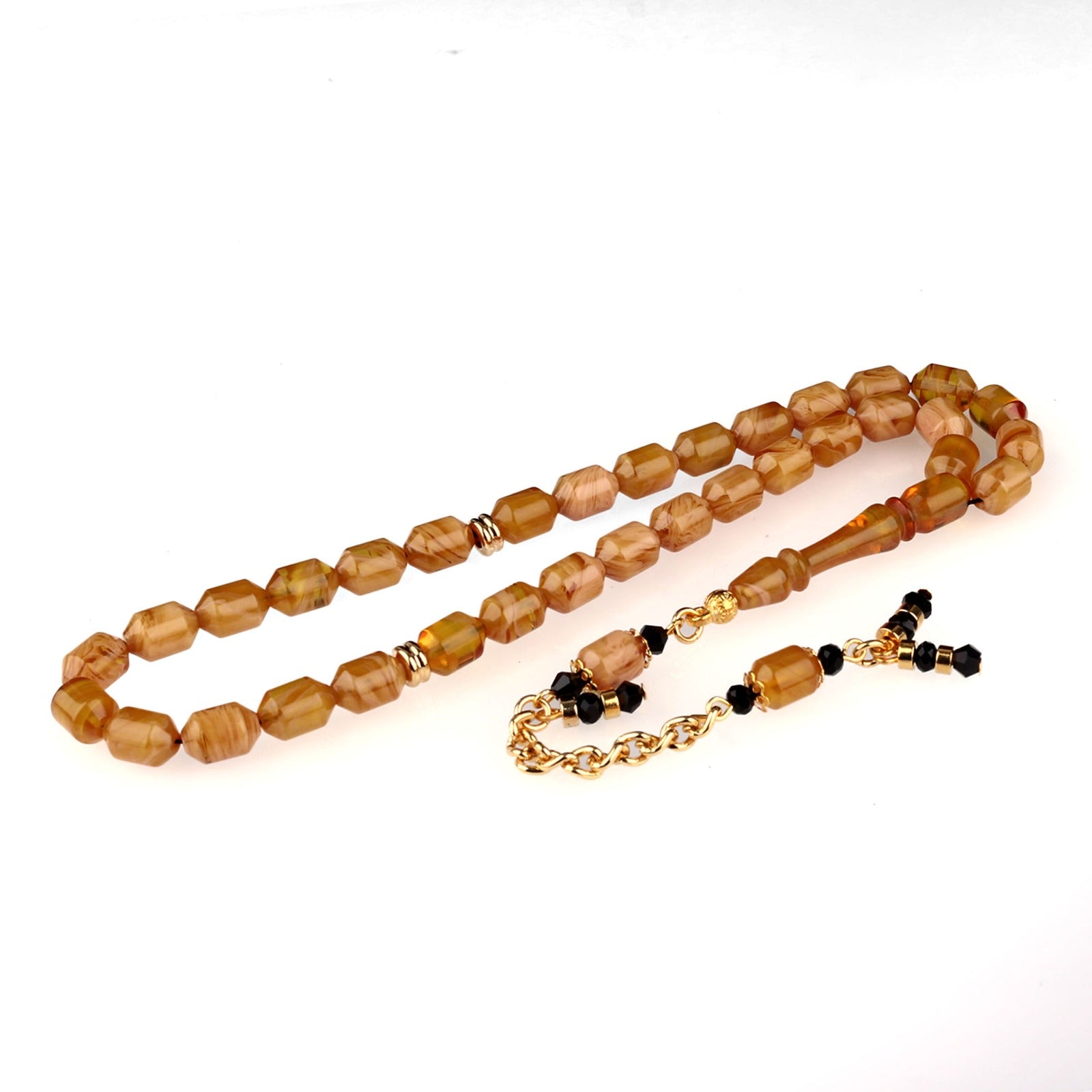 Ebruli bal ton ateş kehribar taneler, gold metal ara parçalar ve siyah boncuk detaylı zincir püskül ile şık tesbih.