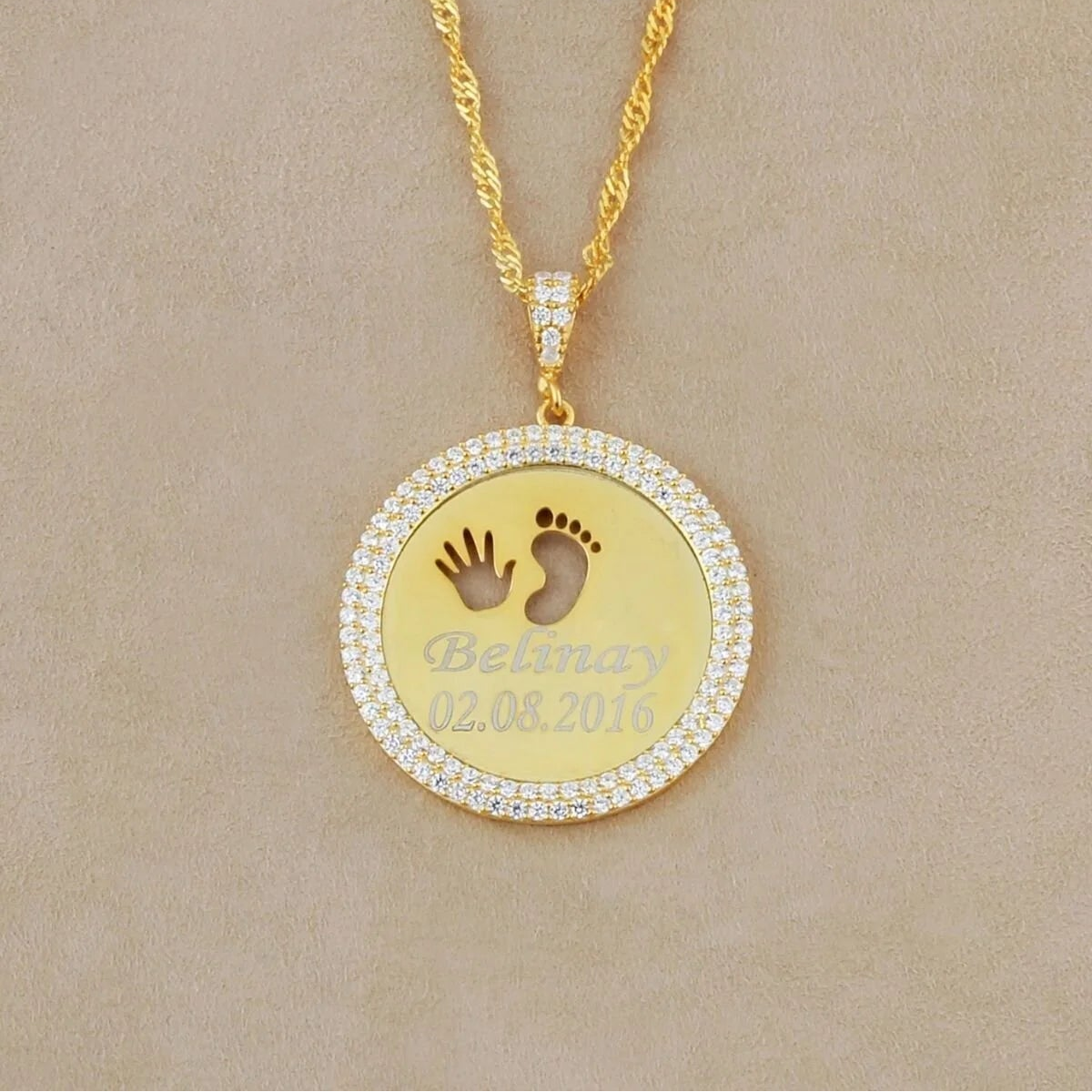 Bebek eli ve ayak figürlü, isim ve tarih yazılabilir kişiye özel 925 ayar gümüş kolye.