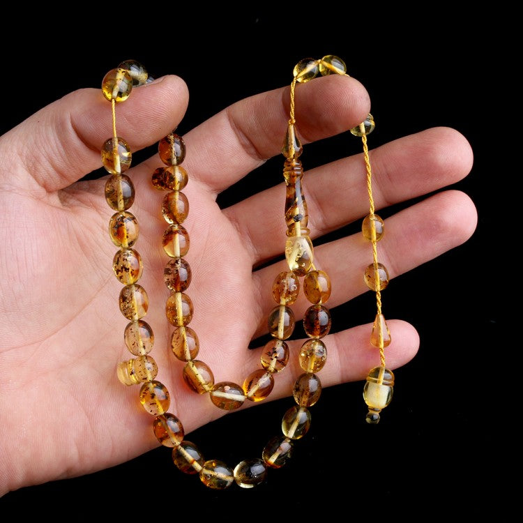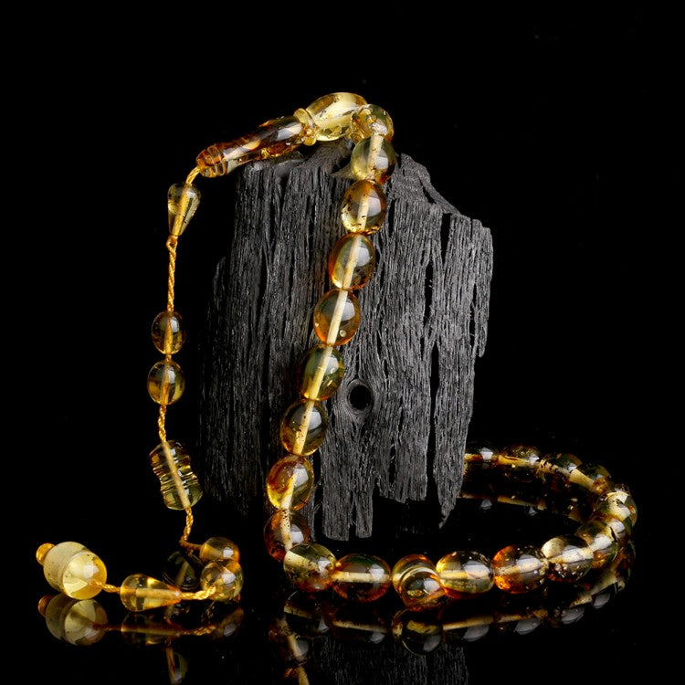 Doğal fosil yapısıyla dikkat çeken, orijinal sistemli sarı damla kehribar tesbih modeli.