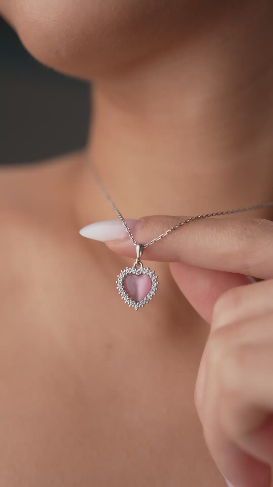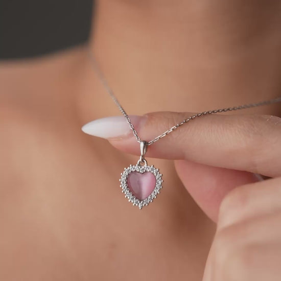 Pembe taşlı, zirkon çerçeveli kalp motifli romantik 925 ayar gümüş kolye.