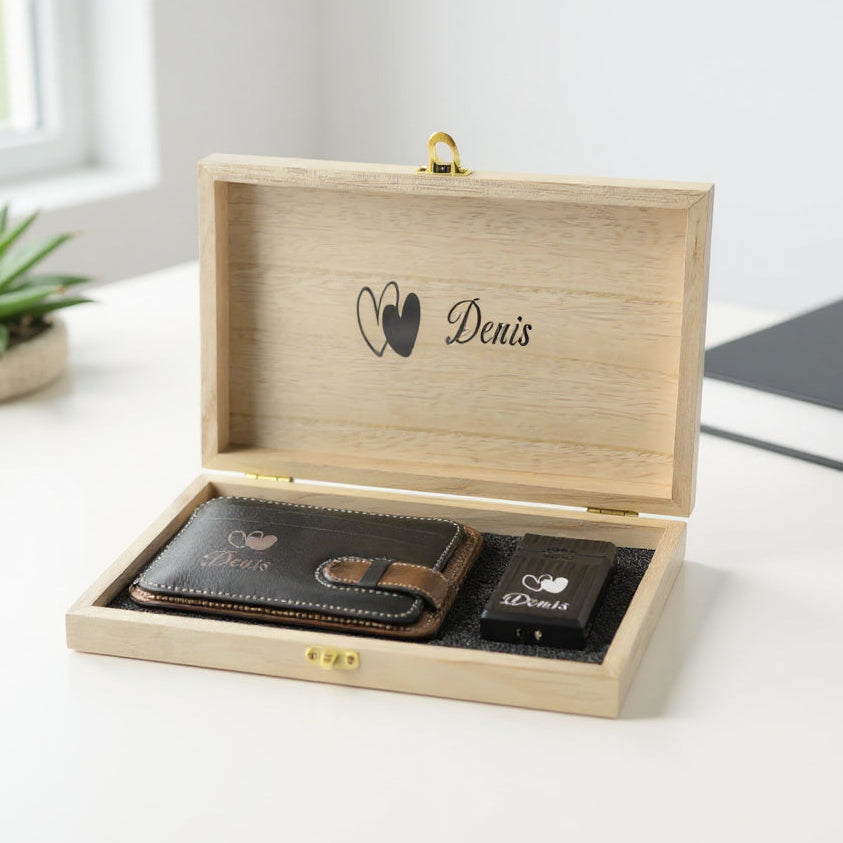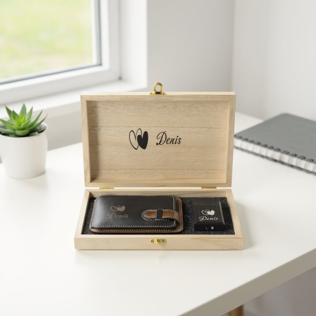 Doğal deriden üretilmiş kartlık ve lazer kazımalı çakmak, ahşap kutuda isme özel şık hediye seti.