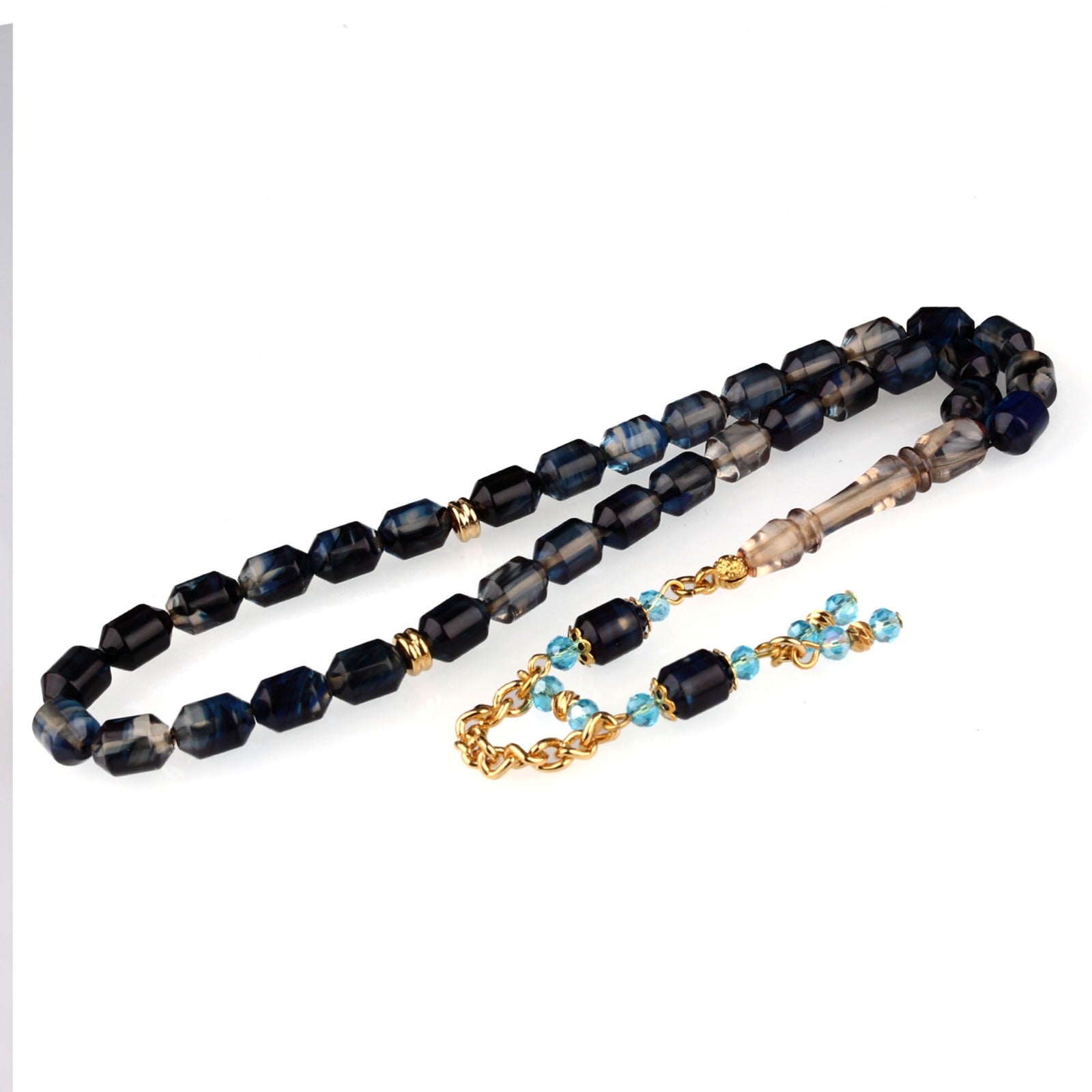 Ebruli lacivert-siyah ateş kehribar taneler, gold metal ara parçalar ve turkuaz kristal detaylı zincirli püskül ile şık tesbih.